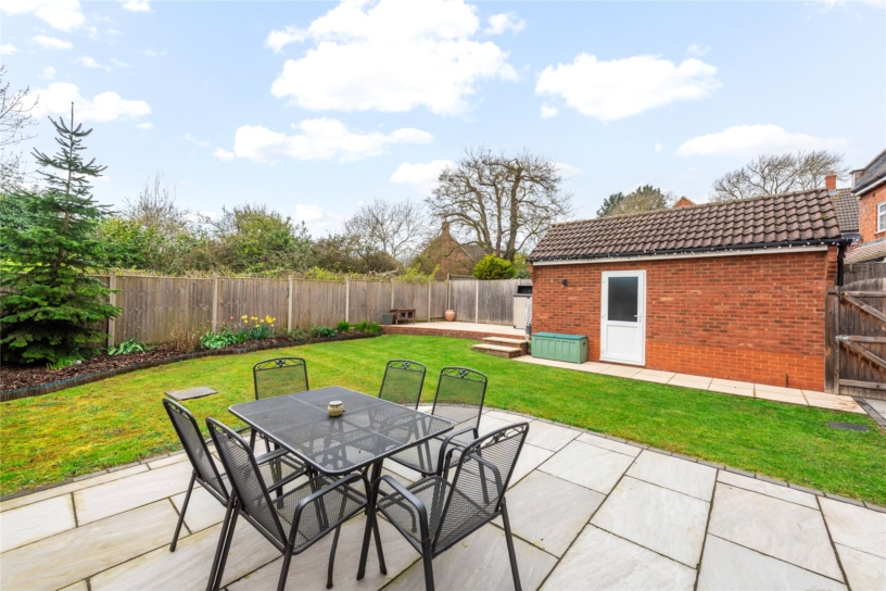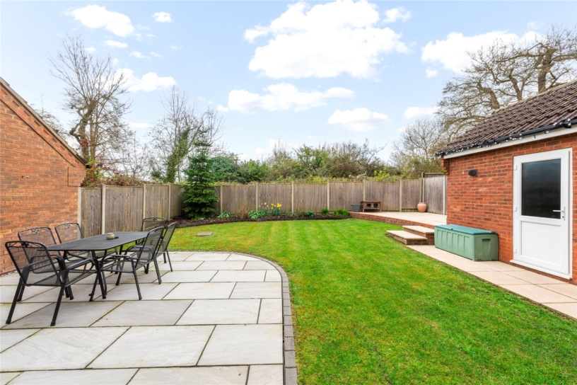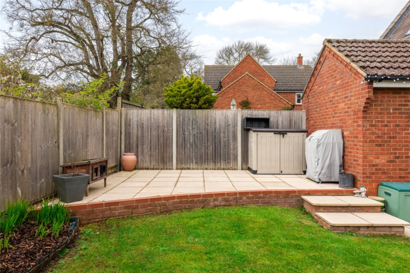 The driveway has parking for up to two cars and access to the 17 ft. garage which has an up and over door at the front and a door to the rear garden. The front garden is designed for ease of maintenance with a lawn, and a paved area and pathway to the front door. A gated side access leads to the south facing rear garden which is enclosed by timber fencing. It is principally lawned with a shrub border and a paved outdoor entertaining area. Steps lead up to a further paved entertaining area suitable for the barbeque.