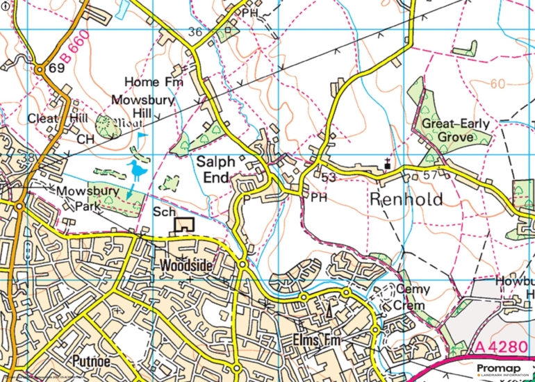 Renhold village is north of the River Great Ouse and has a lower school, church, a public house and a village store. The ruins of Renhold Castle have been designated a Scheduled Monument. Other schools are in Bedford, 4 miles away, including the Harpur Trust schools. The village is within a short drive of the Bedford bypass (A421) which provides access to junction 13 of the M1, Milton Keynes and the A1 and Cambridge. Bedford railway station has services to London St. Pancras International.