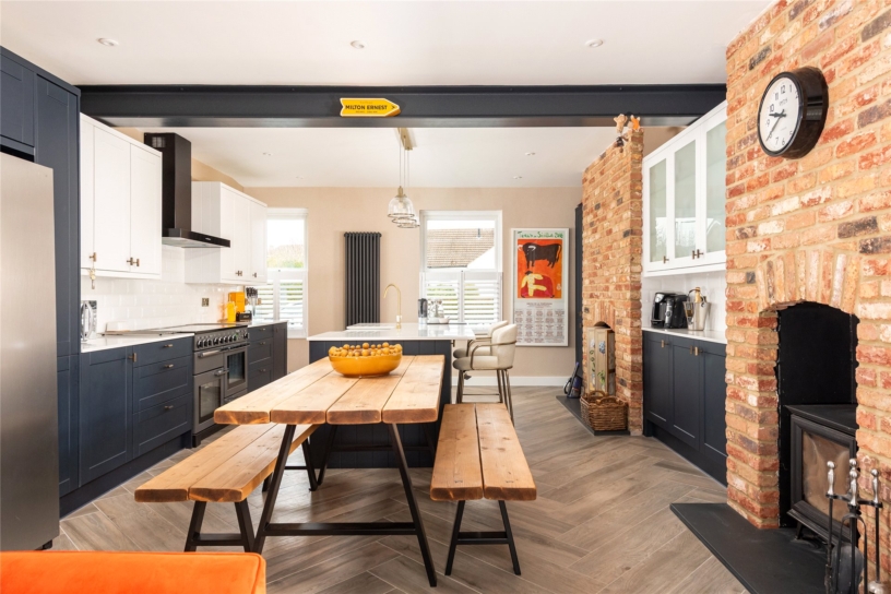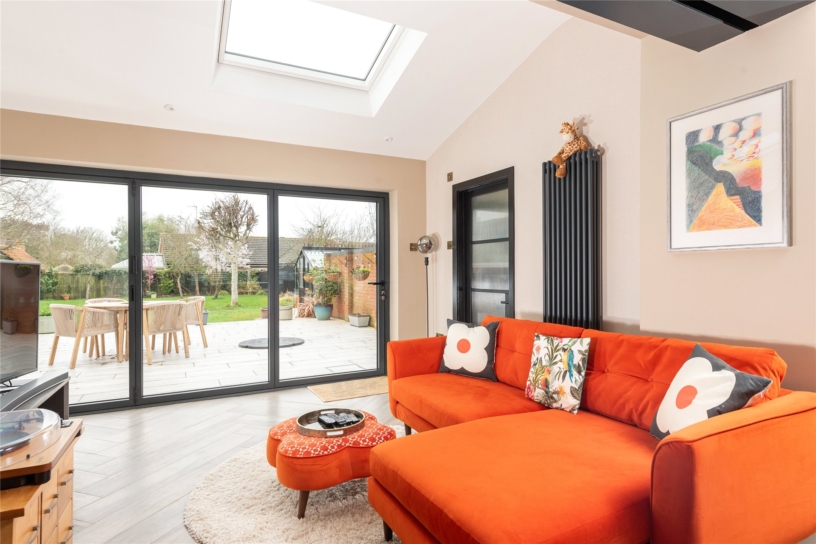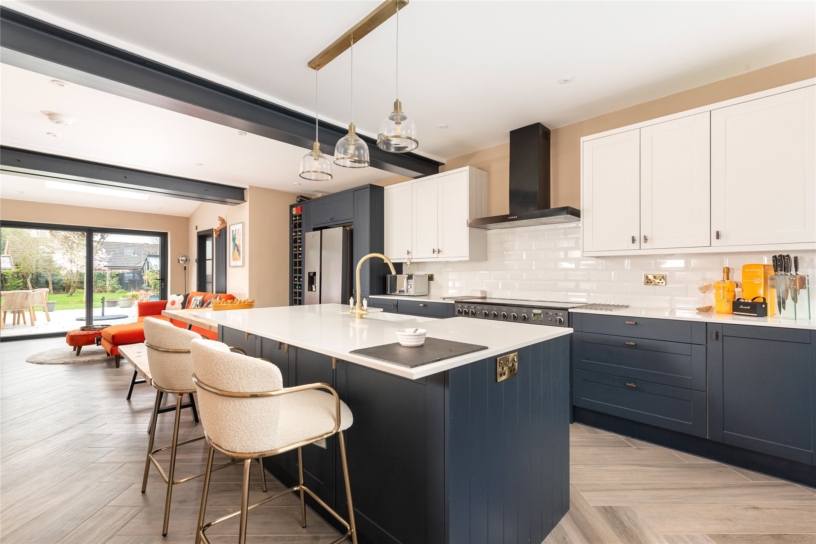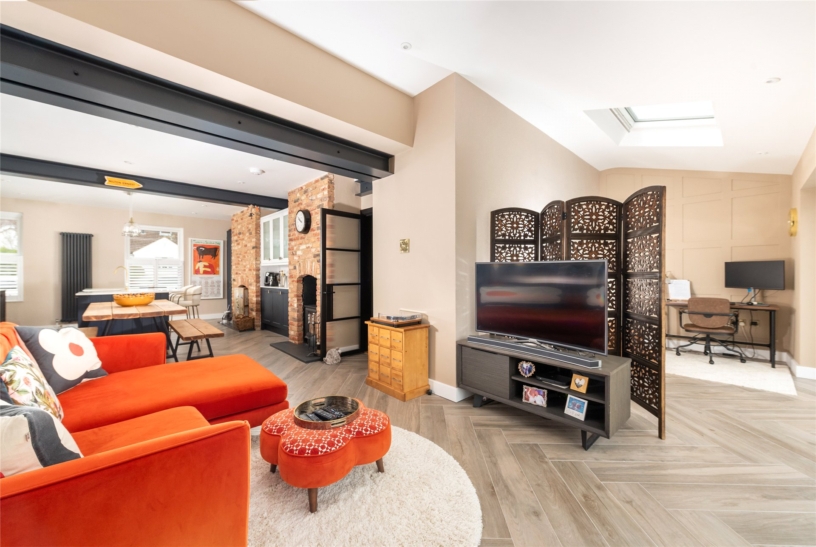 A particular feature of the property is the open plan kitchen/dining/family room which measures nearly 40 ft. and has porcelain tiled flooring throughout. The kitchen has a range of two tone contemporary units including glazed display cabinets and a tall wine rack, with quartz work surfaces and exposed porcelain tiled flooring. The central island has a breakfast bar and incorporates a double butler sink and additional storage cupboards. Integrated appliances include a dishwasher, and there is space for other appliances, including a range style cooker. There are two brick fireplaces, one housing a log burning stove. Windows to the front, skylight windows, and bi-fold doors provide natural light.