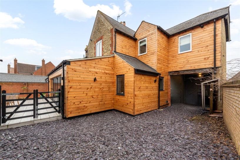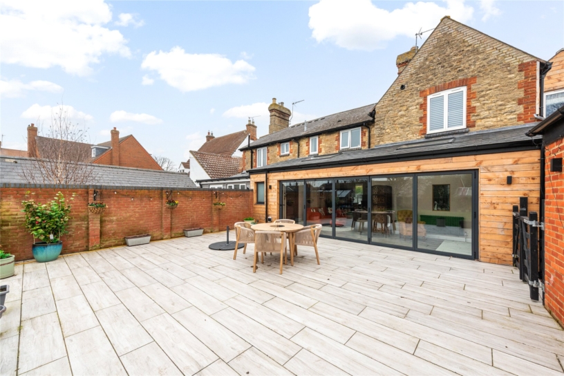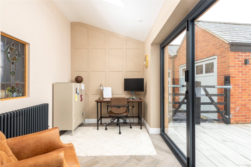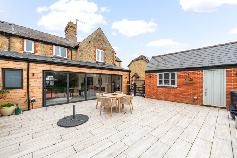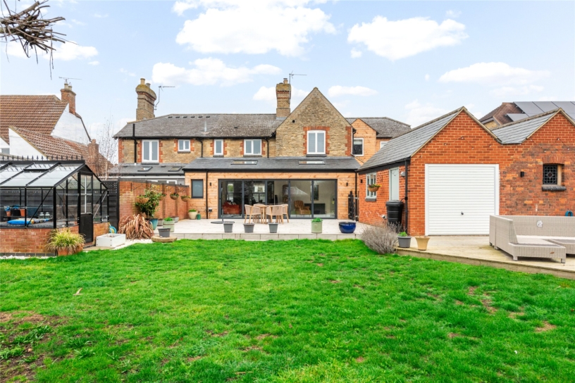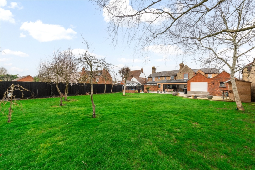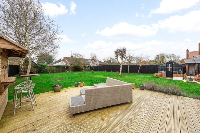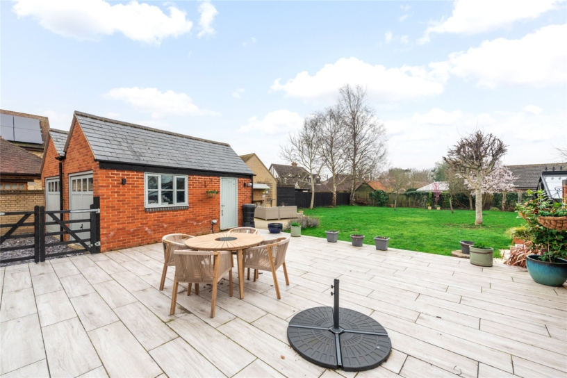 The southerly facing rear garden is fully enclosed by close boarded fencing and is principally lawned with established borders and mature trees including fruit trees interspersed. There is an extensive porcelain tiled outdoor entertaining area and a decked area beyond provides additional seating and has a detached timber outside bar. A brick and glazed greenhouse and brick storage barn will remain.