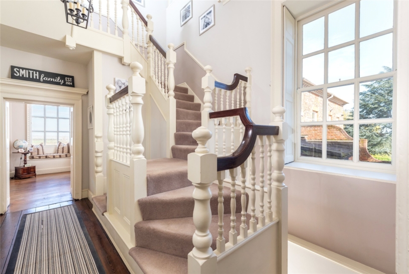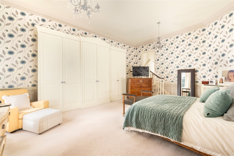 A paired staircase from the inner hall links in the centre and the stairs continue past a mezzanine bathroom to the first floor landing which has two windows to the side, access to bedroom two and stairs up to an inner landing with access to the principal bedroom suite and bedroom three. The inner landing has a shelved airing cupboard, and another walk-in shelved store room. A trapdoor in the floor of this store gives access to a winch for raising and lowering the drawing room chandelier for cleaning.