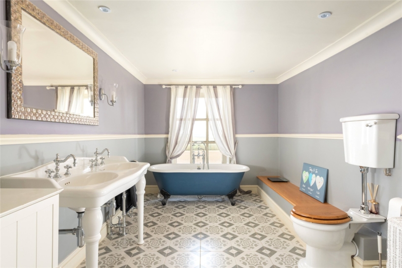 The principal bedroom has steps up to a vestibule which has a door to the inner landing, and a built-in double cupboard. This vestibule leads to the principal bathroom which has a claw footed bath with a shower attachment set under a sash window with views to the front. There is also a twin washbasin, a heritage WC, a separate shower cubicle with rainwater and standard showerheads, and two double towel radiators.