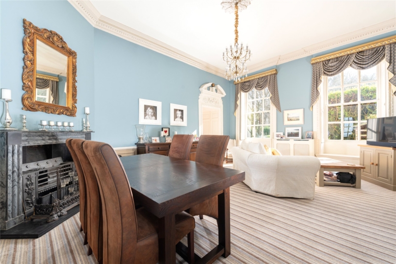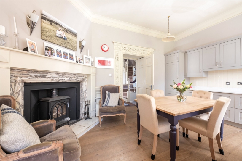 The dining room has two tall sash windows with shutters, and windows seats overlooking the rear garden. The internal doors have ornate architraves and decorated pediments, and include a false door which formerly led to the other parts of the mansion. There is wall panelling to dado height and an original fireplace with a marble surround and a decorative cast iron grate. The fireplaces in both reception rooms are in working order and the chimneys are swept annually.