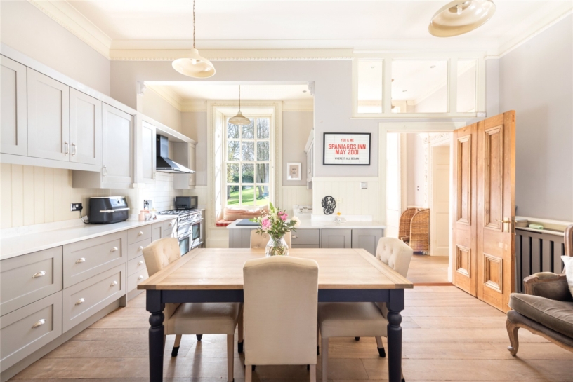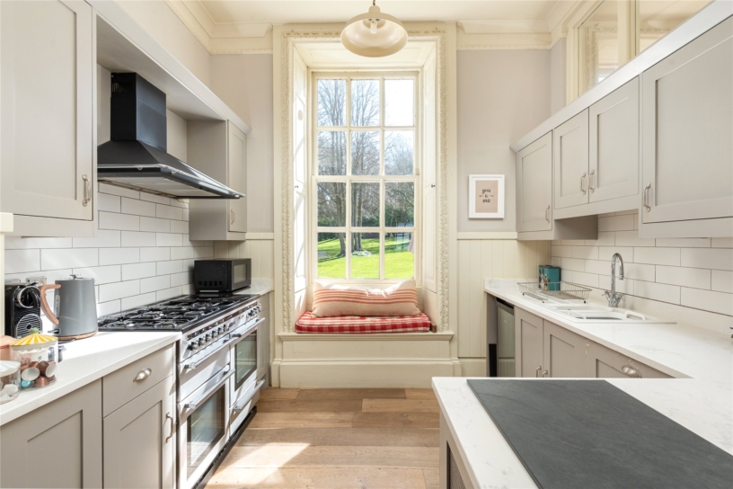 The kitchen/breakfast room has ornate coving, a dado rail, Amtico wood effect flooring throughout, and a tall sash window with an ornate architrave, shutters and a window seat overlooking the rear garden. Additional natural light is provided by borrowed light windows to the adjoining porch. The door from the kitchen to the inner hall has a particularly fine example of a decoratively carved architrave.