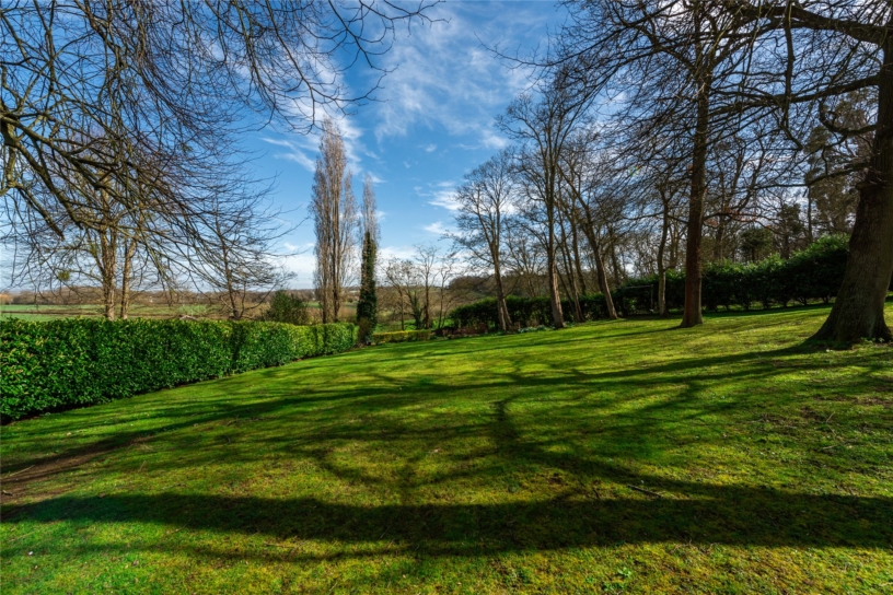 The private rear garden is south easterly facing. It has a gate to adjoining private woodland, and views over the surrounding open countryside. The garden is mainly laid to lawn with established herbaceous borders, several seating areas for relaxing and entertaining, and is screened by mature hedges and mature trees for privacy.