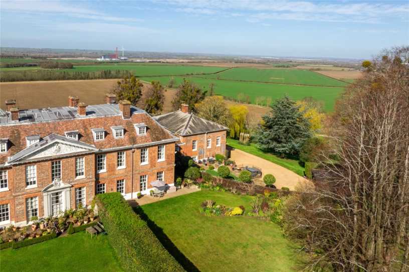 The mansion is on an elevated plot and is accessed via a gravel driveway which gives across to the house and the garage blocks. The property has a double garage with parking in front for three cars in addition to the five which can park in front of the house. The land in front is grassed with several mature trees, and slopes gently down from the mansion to open fields beyond