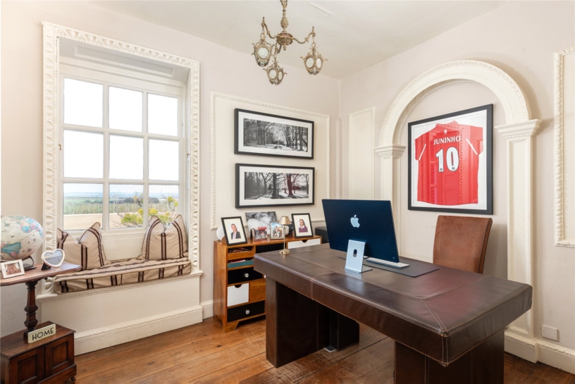 The study has exposed wood flooring, and a sash window with a decorative architrave, shutters and a window seat from which to enjoy the far reaching views. There are decorative wall panels and a feature arch. A door leads to an L-shaped cloakroom which has a WC and a vanity washbasin.