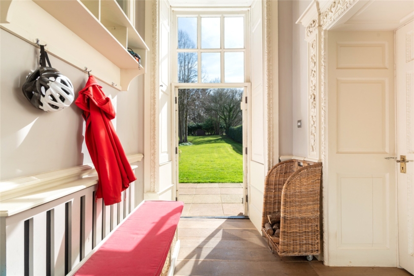 The property is accessed from the drive via an arched opening leading to a covered area which has a side door to the lower ground floor of the property, or a secure gate with keypad entry which opens to steps and a path to the rear of the house where glazed double doors lead into a porch/boot room which has storage for coats and shoes, and doors to the kitchen/breakfast room and the formal dining room.