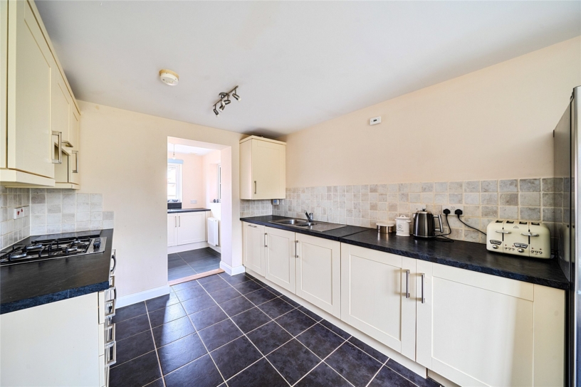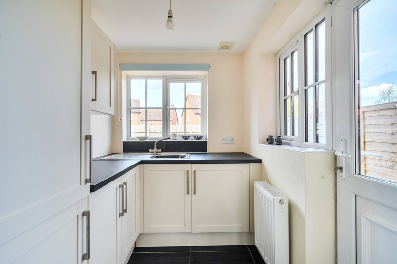 A particular feature of the property is the open plan kitchen/dining room which measures over 16 ft. The kitchen is fitted with a range of base and wall units with complementary work surfaces and tiled flooring. Integrated appliances include an electric oven, a gas hob with extractor over, and there is space and plumbing for an American style fridge/freezer. There is an opening to the adjoining utility room which has additional storage, plumbing for washing machine, and a door to the side.