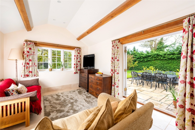 The 2015 Kitchen/breakfast/dining area, once the old barn, measures over 30 ft. by over 17 ft. and is open plan with the over 18 ft. by over 11 ft. family room. These adjoining rooms have French windows at right angles to one another, opening to the patio at the front and the main garden. The dining area also overlooks the rear garden and has space for a dining table seating up to ten. The family room, including the French window, is triple aspect. The entire open plan area has limestone flags with underfloor heating. The kitchen/breakfast area has a vaulted ceiling with modern, exposed oak A-frames spanning the room and a window high in the gable end. There are bespoke, solid French oak Fired Earth base units with granite worksurfaces and an inset butler’s sink. The central island has a matching worksurface, storage under, and breakfast seating. There is a five-oven Total Control AGA, with a granite splashback, an integrated Bosch dishwasher, and space for a fridge/freezer.