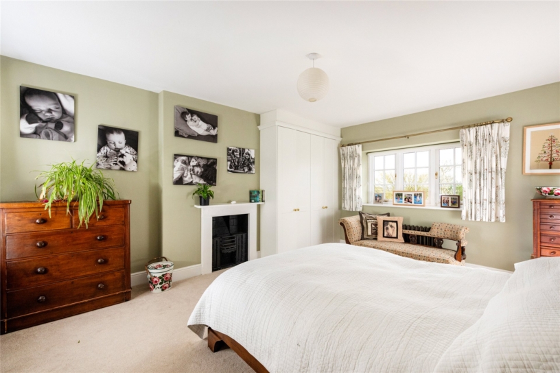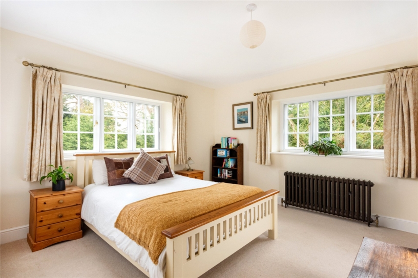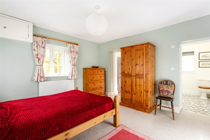 Measuring over 16 ft. by over 12 ft., the dual aspect principal bedroom has casement windows overlooking the front and rear gardens with far reaching country views. There are built-in double wardrobes in keeping with the age of the house and a period cast iron bedroom fireplace with the original basket for hot coals. A door opens to the walk-in-wardrobe which has a window over the front and built-in shelving and drawers. A further door accesses the en suite shower room which has a window over the rear, a Victorian style WC with a raised cistern, a pedestal hand basin, a walk-in shower, and a heated towel rail.