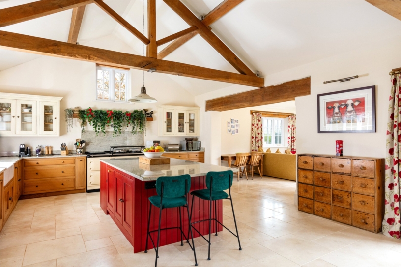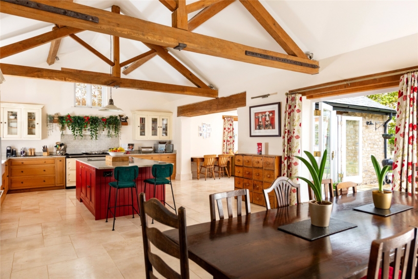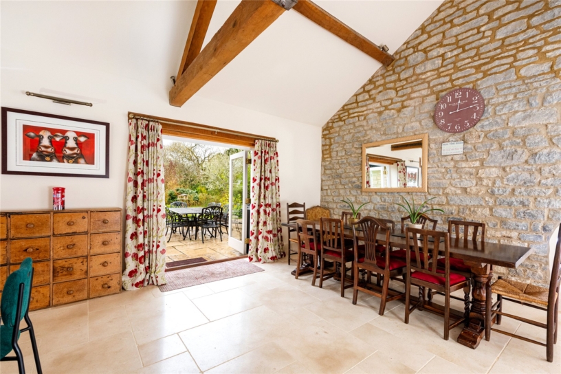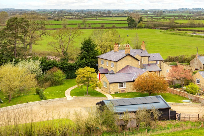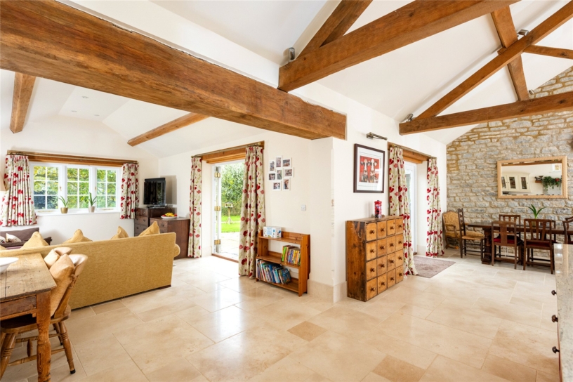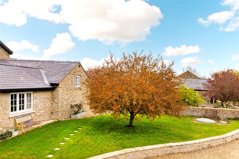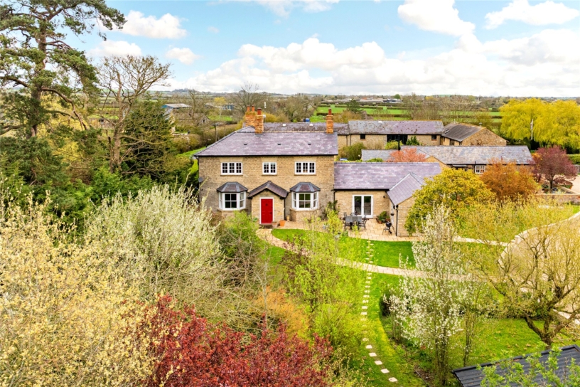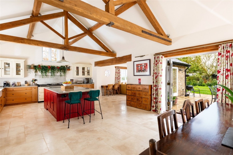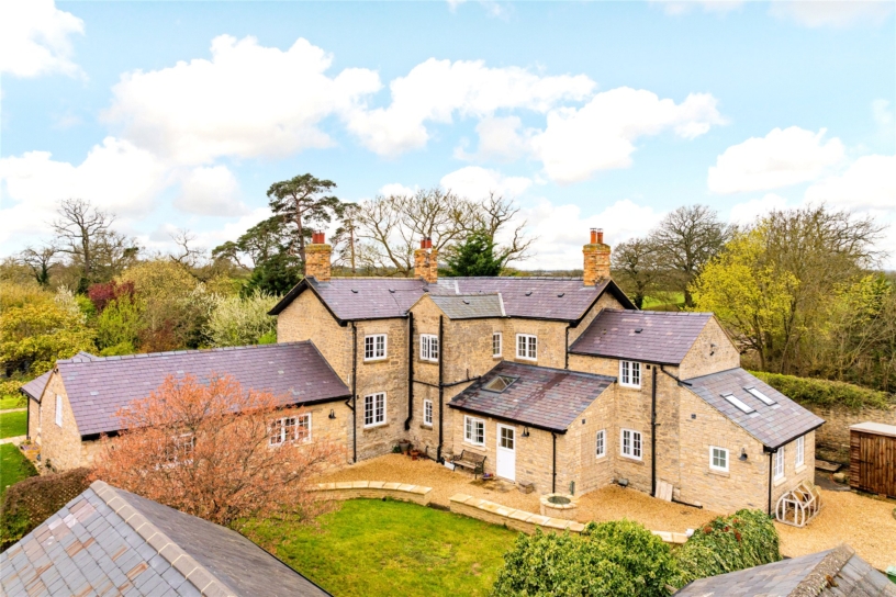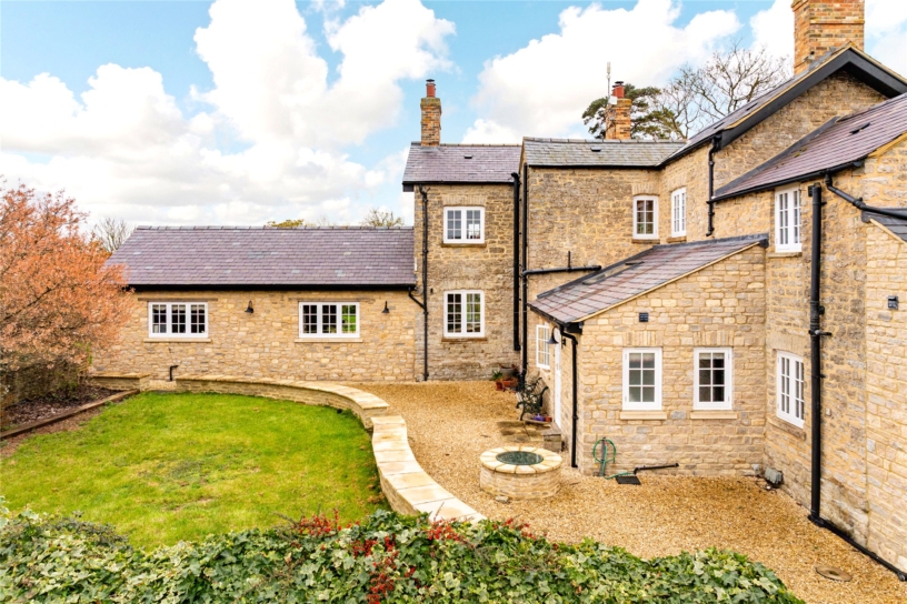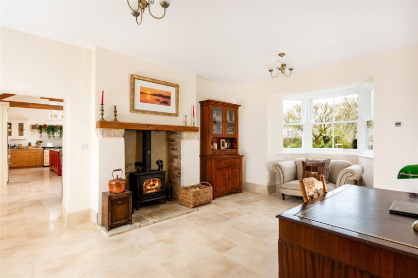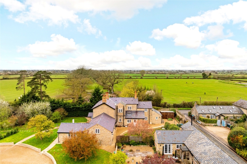 Thought to have been built in the mid-18th century, this Cotswold stone farm, outside Marsh Gibbon, is surrounded by open farmland but has connections to Oxford and Bicester, with train links to London. The George II building was updated during the 19th- century and has recently been sympathetically restored by the current owners who have converted an adjoining agricultural barn to an open plan kitchen/breakfast/dining room. All modernisation has been done to high specification, but care has been taken to retain original features such as interior exposed stone walls, the Georgian staircase, and a first floor fireplace. Where rebuilding was necessary, exemplified by the open fireplaces, original structural timbers, building stones and flags were conscientiously reused. As a result, the house provides convenient and flexible living accommodation, including a ground floor annexe which could be used for intergenerational living or guests, while retaining the integrity of the farmhouse.