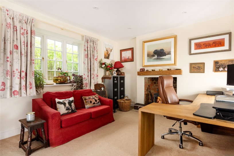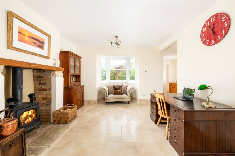 Once the kitchen in the original farmhouse, the over 15 ft. by over 12 ft. study retains an open brick fireplace under a wooden lintel with a wood burning stove on a slate hearth. Built-in furniture includes a double doored cupboard with drawers beneath and the minimalist bespoke built-in oak desk. Casement windows overlook the side and a further casement window into the boot room allows borrowing of light between both rooms.