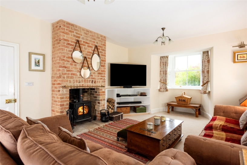 With another period panelled door and an identical bay window with the same aspect as that in the reception hall/office, the sitting room is larger, measuring nearly 24 ft. by over 13 ft. It has a floor-to-ceiling exposed brick chimney breast housing a wood burning stove on a flag stone hearth. In an alcove to the right is modern fitted shelving with a space for stacked firewood; there is further built-in shelving on the north wall. The west wall has a casement window over the side garden and a raised window which was once the transom window over the original Georgian front door.
