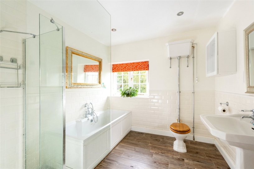 The family bathroom has partial metro tiling, including splashback areas, and a window overlooking the garden. There is a Victorian style three piece suite including a panel bath with central taps, a WC with a raised cistern, and a walk-in shower with glass screens. The floor has wood effect laminate flooring and there is a heated towel rail.