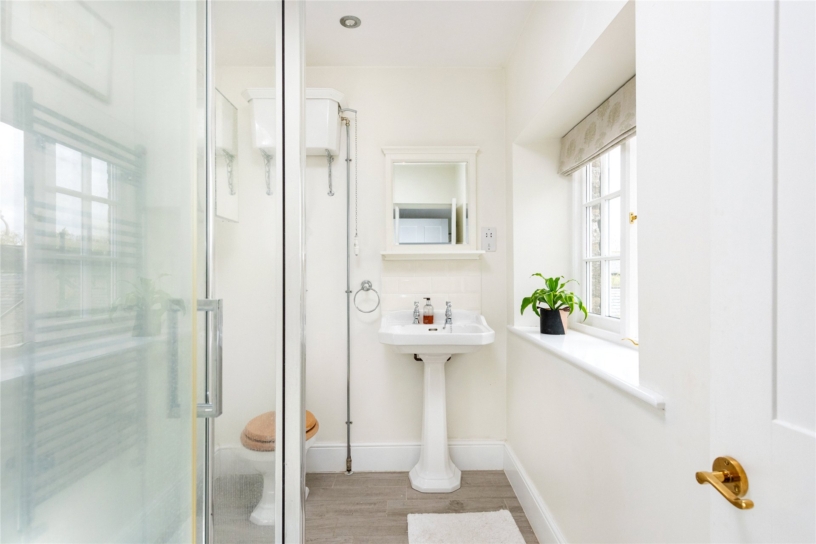 Dual aspect bedroom two has casement windows overlooking the front and side and measures over 16 ft. by over 14 ft. It has built-in wardrobes and a door to an en suite which has a walk-in shower, a pedestal hand basin and matching WC, and a heated towel rail.