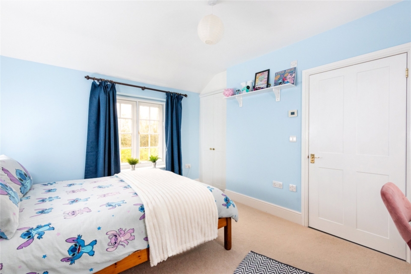 All five bedrooms in the house are double, including bedrooms three and four. At the end of the landing, bedroom three has three steps down. This dual aspect bedroom measures over 13 ft. by over 12 ft. and has casement windows overlooking each side. There is a built-in double doored wardrobe with fitted internal drawers and a door to the en suite. This three piece shower room has an automatic light, wood effect laminate flooring, and tongue-and-groove panelling to dado height. Accessed via an angled door off the landing, the smallest of the bedrooms is, however, over nearly 12 ft. long and has ample room for a double bed. There is a casement window overlooking the side and built-in wardrobes with fitted internal drawers and access in the ceiling to the second boarded loft space.