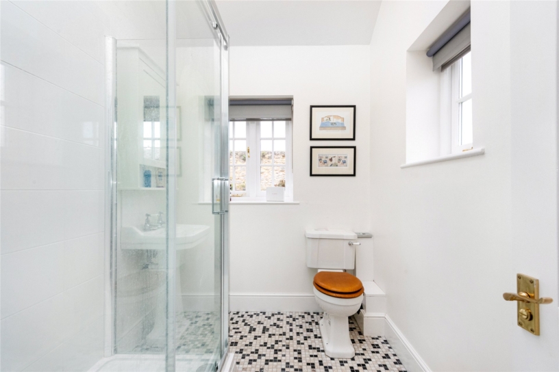 The dual aspect, over 12 ft. square fifth bedroom is on the ground floor with casement windows overlooking each side of the house and a raised meter box. Doors open to the en suite shower room on the right with a mosaic tiled floor, a pitched roof with a Velux skylight and an obscured window overlooking the rear garden. Doors access, on the right, a dual aspect, three piece en suite with a double shower, a pedestal basin, and a matching WC; there is a heated towel rail. The door on the left opens to the kitchen, again with a pitched roof and a Velux skylight, and a Karndean wood effect floor. There is a window overlooking the garden above a stainless steel sink which is inset in the wood effect worksurface. There are base and wall fitted units, an oven, and a hob with an extractor above and space for a full-height fridge. The annexe has an independent water supply and a separate thermostat.