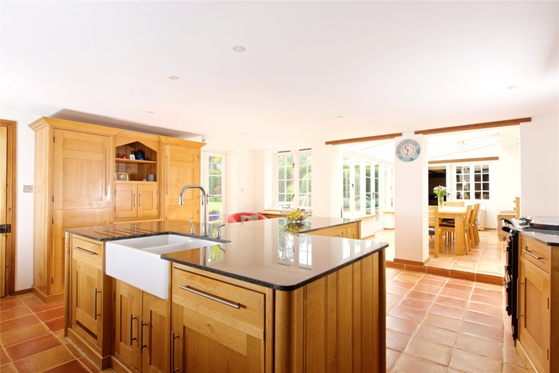 The kitchen/breakfast room has a range of bespoke solid oak wall, floor mounted and full height fitted units with granite work surfaces. Integrated appliances include a fridge/freezer, a Neff electric hob, two Neff fan ovens and there is a two oven oil fired AGA. A matching island has an inset double butler sink and under storage as well as a breakfast bar. It also has an integrated dishwasher and fridge. There is a plate rack and a feature exposed stone inglenook. Terracotta tiled flooring continues from the family room and there are double doors to a terrace in the rear garden.