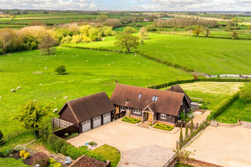 A contemporary barn style four bedroomed house with a separate triple garage and driveway parking, on a plot of over half an acre overlooking countryside in the heart of Padbury village conservation area.
