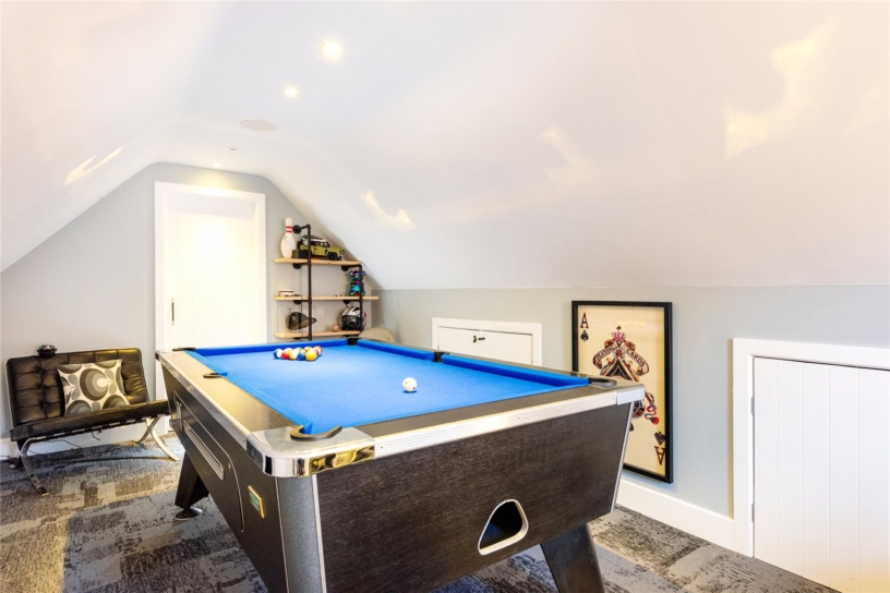 Bedrooms two and three at each end of the house have mirrored plans. Both have gable end windows, double doored eaves storage with internal lights, and a built-in wardrobe. Bedroom two is different because there is a hideaway area which can be reached through the back of the built-in wardrobe. Carpeted and lit, in the past this cubby hole has been a favourite secret camp for a child. Like the en suite shower room, the family bathroom has underfloor heating and Fired Earth fittings. Built into the eaves space, with a Velux window, there is an oversized panelled bath with a shower fitting above and a glass screen, a WC, and a long basin inset in a quartz top on a handmade cabinet. The walls and floors have porcelain tiles and there is a heated towel rail.