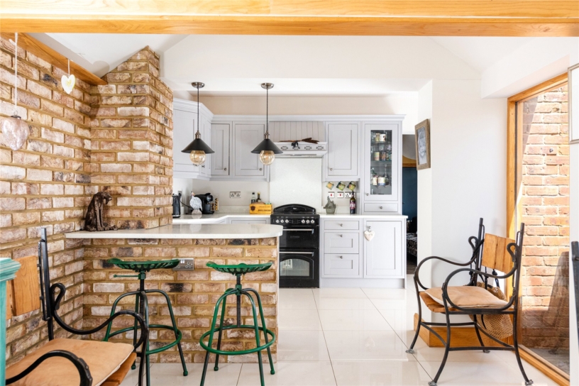 The kitchen has been refitted with a range of Shaker style units with granite worksurfaces. There is a breakfast bar and space for a range style cooker. Tiled flooring extends to the breakfast room. A modern extension at the rear has a pitched ceiling and French doors to the rear garden. At the front of the property there is an open plan sitting/dining room with wooden flooring, a brick fireplace with a wood burner, and a sash window overlooking the front aspect.