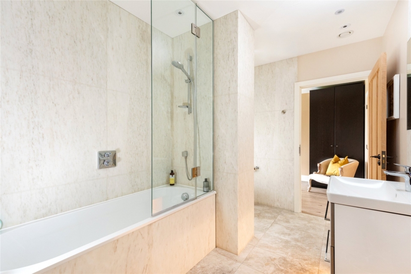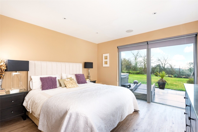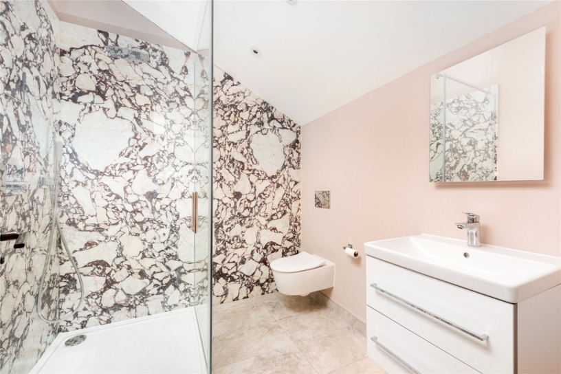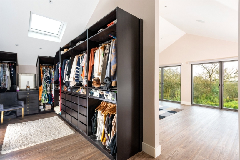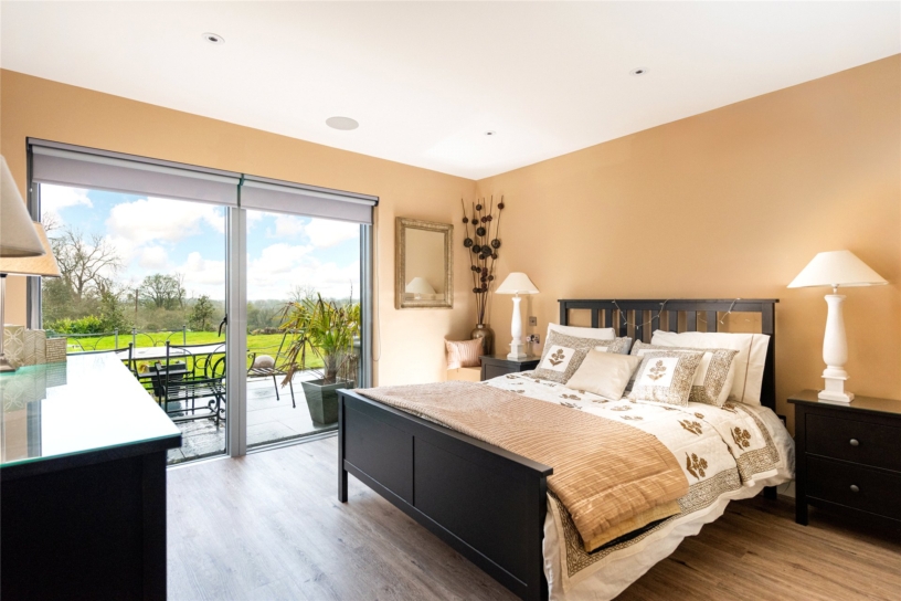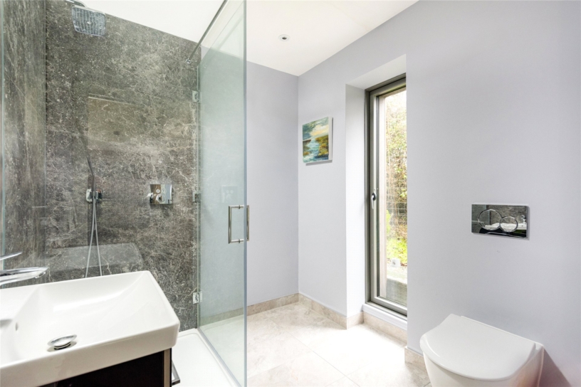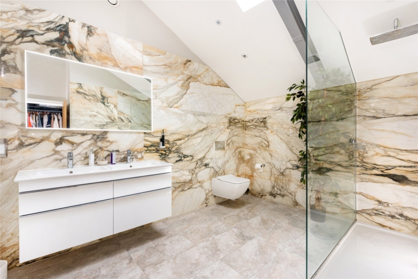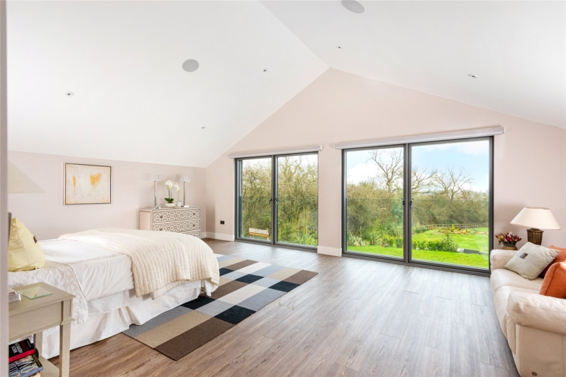 The principal bedroom measures over 24 ft. by over 15 ft. and has the same vaulted height and exposed structural steels as the open plan reception space. It also has a similar arrangement of double opening doors filling the gable end as in the north end of the kitchen area, but here taking in views of the formal south facing garden and beyond. (The windows have the same automatically operated blinds as the kitchen area.) A walkthrough from the bedroom leads into a similarly vaulted dressing area with a Velux window and built-in bedroom furniture including a dressing table and chest of drawers alongside three walls lined with wardrobes with drawers, hanging, or shelved storage. A door leads to the vaulted en suite bathroom which has a Velux window and strikingly-figured outsize marble wall tiles. There is a walk-in double shower with a glass screen, a modern hanging vanity unit with double basins, a mirror with a sensor over, and a hanging WC with a concealed cistern.