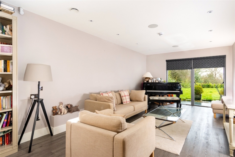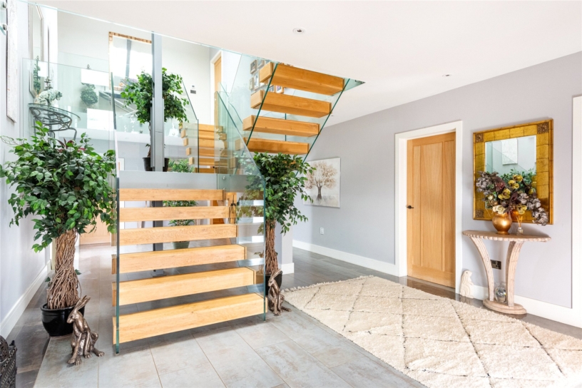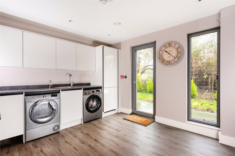 The entire house has underfloor heating beneath either high spec wood-effect laminate, or stone tiled floors in the entrance hall and cloakroom. The doors throughout the house are solid oak. The entrance hall contains the unusual contemporary handmade staircase with open oak treads and double glass balustrading, which make the staircase appear to float and allow light to pass throughout the area from the front door and the triple Velux windows above the stairwell. There is a cloakroom with marble tiled walls and a floor-to-ceiling window. A utility/boot room has laminate flooring, a floor-to-ceiling window overlooking the drive and fitted gloss fronted units with a contrasting worksurface and space and plumbing for a washing machine and tumble dryer.
