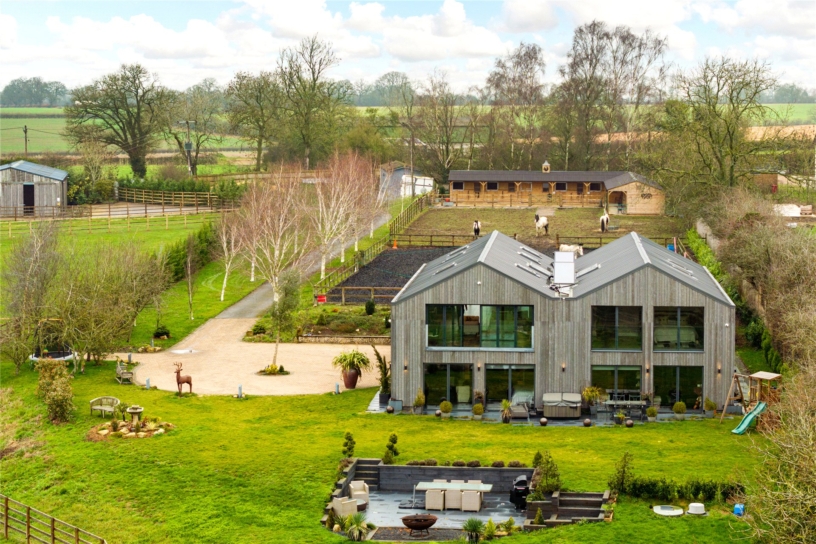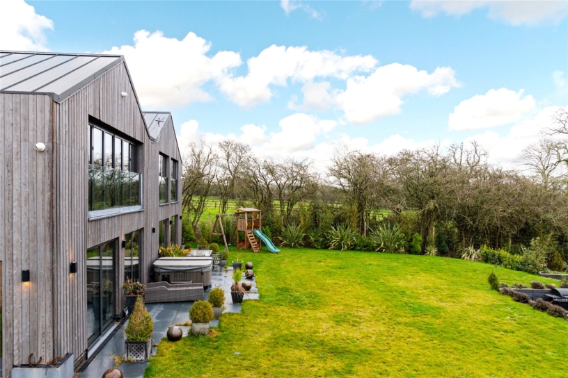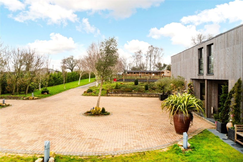 A tarmacadam drive lined by lawn and floodlit silver birch trees passes the stables, paddock and manège as it approaches the front of the house before widening into a circular driveway. The block paved drive has a central specimen tree and raised borders on the north side. The house feels secluded because it is surrounded by its own land and the south-facing formal garden is deceptively low-maintenance, being laid mainly to lawn. Within the lawn is a sunken paved seating and fire pit area, reached by steps, its raised borders planted with clipped lavender and standard bay trees. The side border has a sculptural planting scheme with phormiums and eucalyptus against open wire fencing which visually includes the mature hedges and trees. The expanse of windows in the south end of the house provide far-reaching views of the garden and countryside beyond. A paved patio at the south end with a jacuzzi also allows the patio doors of the ground floor accommodation immediate access to the garden.