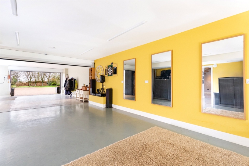 The garage is accessed via a remotely-controlled roller door off the front drive or through a personnel door off the entrance hall. An internal roller shutter, also automatically operated, can be lowered to bisect the over 48 ft. by over 16 ft. space. There is a treated concrete floor with underfloor heating in the rear, eastern part, with windows over the side, which is currently used as a gym. It has light and power connected as well as a further fuse box.