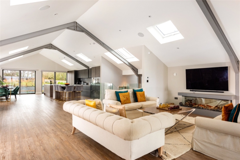 Accessed from the staircase with a glass balustraded gallery, this open plan room spans the full width, and half the area of the entire first floor. The over 49 ft. by over 24 ft. space has exposed structural steels supporting a vaulted roof with Velux windows. The north gable end has two sets of Danish state-of-the-art aluminium sliding doors with glazed balusters overlooking the manège and stables beyond. Two further tilt-and-open full-height windows overlook the front drive. The doors/windows in this room have full-length, rechargeable lithium battery powered wireless blinds. A glass sliding door spans the width of the room towards the south end, opening to the interior balcony; there is also a secret door into the principal bedroom suite. The seating area has a modern electric fireplace with changeable light effects set in a Corian surround.
