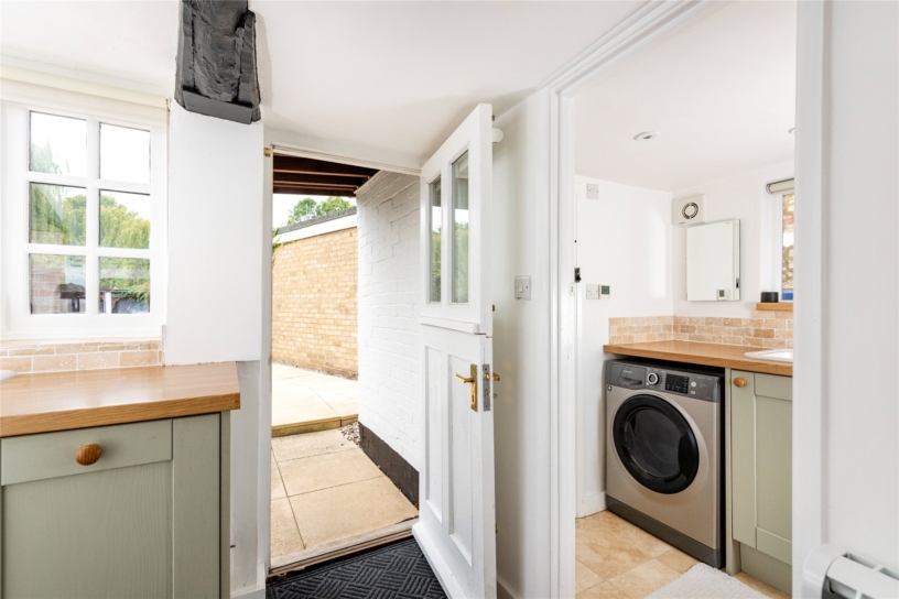 The sitting room is bay fronted and has exposed ceiling beams and a fireplace housing a log burner. Wooden flooring extends into the dining room which could be used as an office. The kitchen has a range of Shaker style units with wooden worktops and a ceramic sink with a single drainer. Integrated appliances include a four ring ceramic hob with an extractor, an electric oven, a fridge, and a dishwasher. There is a stable door to the rear and an opening to a utility room with a further range of storage, a sink, space for a washing machine and ceramic tiled flooring with under floor heating. A door leads to a two piece shower room at the rear.
