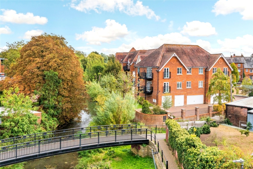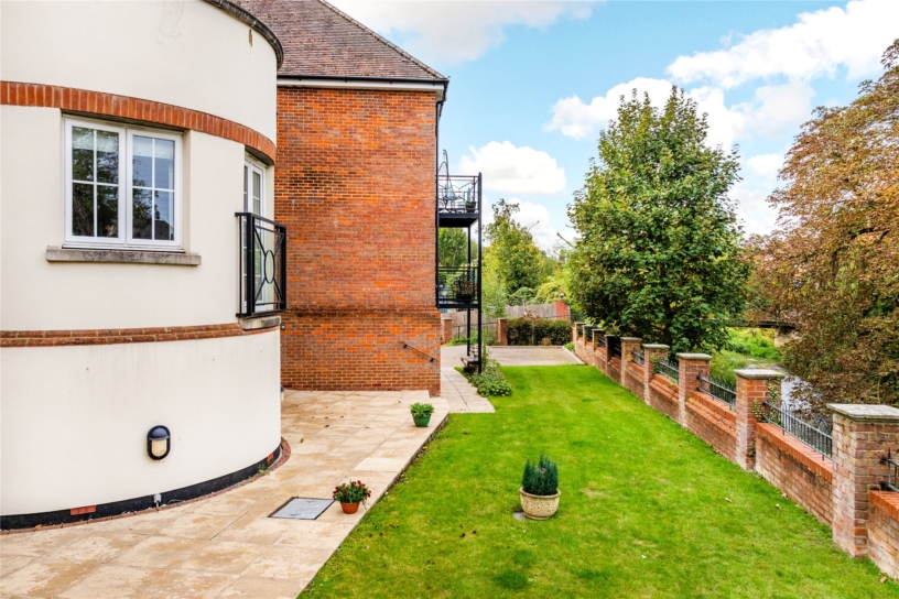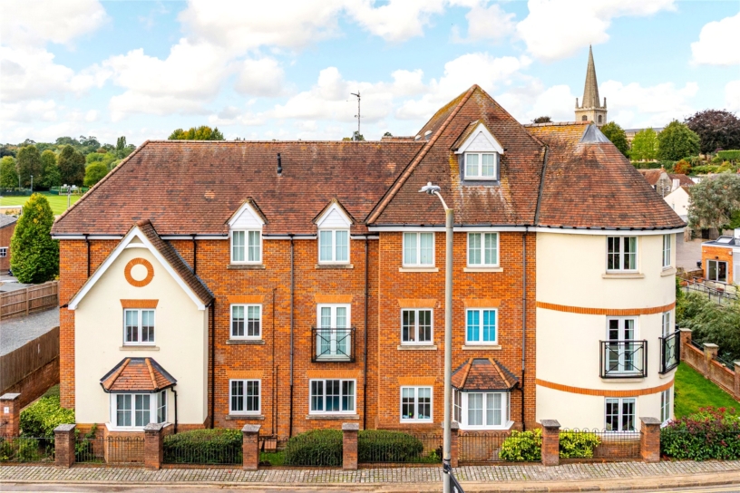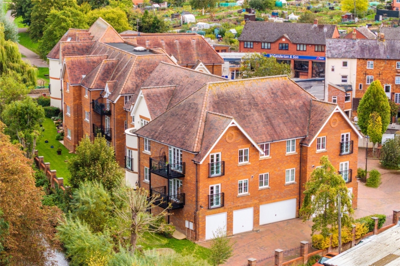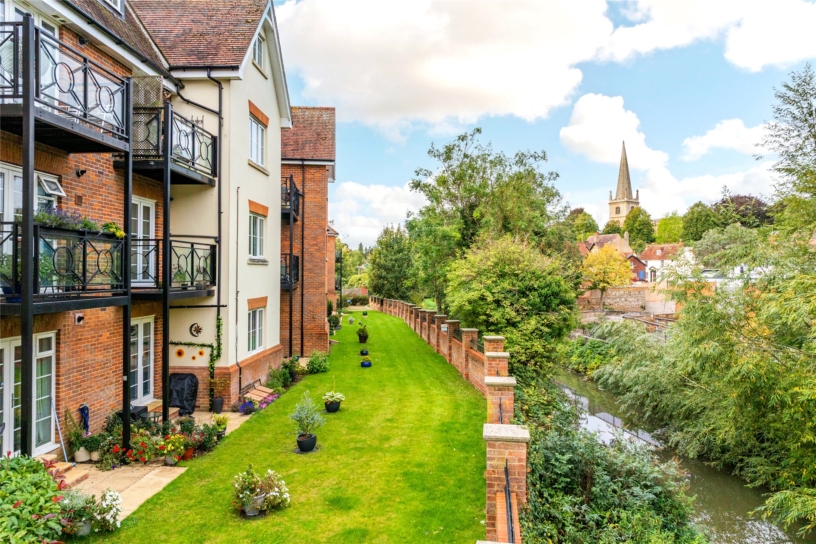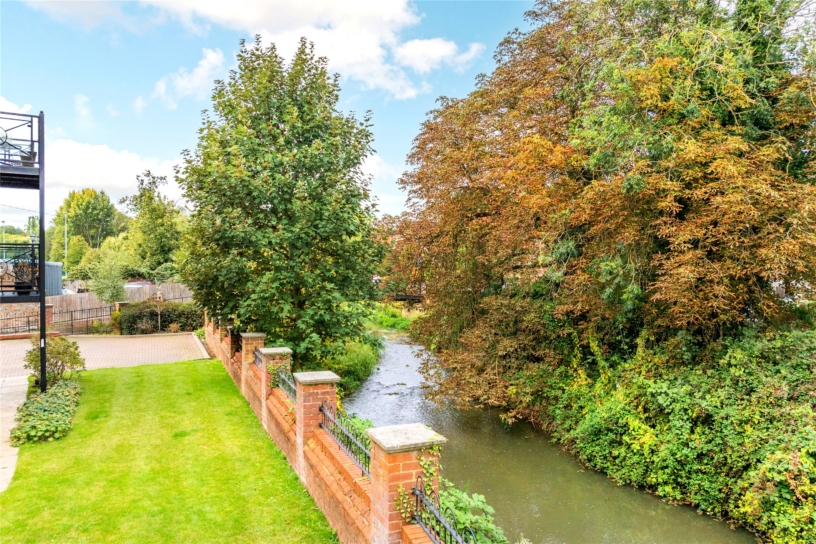 The apartment, built by W.E Black in around 2007, has a combined approximate 1,209 sq. ft. of accommodation arranged over two floors, including the garage. Accessed via a communal entrance hall with a telecom entry system, the apartment has an entrance hall with a three piece tiled shower room, a contemporary spiral staircase rising to the first floor, and storage. There is a fitted kitchen/breakfast room and an open plan sitting/dining room which has a balcony overlooking the gardens and the tree-lined River Great Ouse below. On the first floor there are two double bedrooms; the principal bedroom has a range of fitted wardrobes and a three piece en suite bathroom with fitted cupboards and tiled walls. Outside there is block paved residents' parking and the garage with an up and over door. The communal gardens are enclosed by brick walls with railings and mainly laid to lawn.