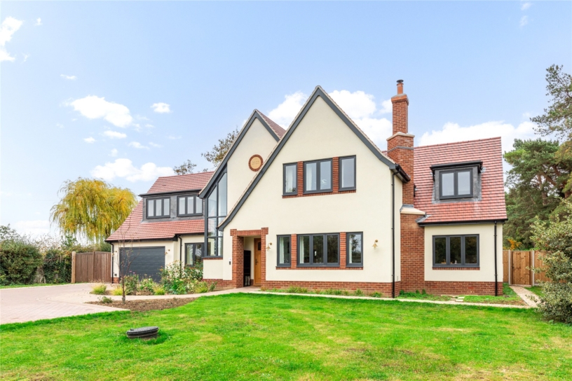 The gardens are a particular feature of the property and are more established than those of many new houses as the bungalow gardens were carefully protected while building work was under way. At the front an extensive block paved driveway has space to park at least five cars in addition to the garage which has a remote controlled electric up and over door. There is an EV charger in the garage and wiring is in place for a further charger outside the garage if required. A block paved path leads to the porch, and there is a lawned area and established shrub and flower beds and borders.
