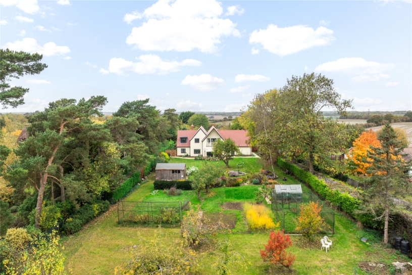 The property is set back from the road with extensive parking on the block paved driveway in addition to the garage. The plot of 1.37 acres includes established front and rear gardens and a field and is surrounded by open countryside.