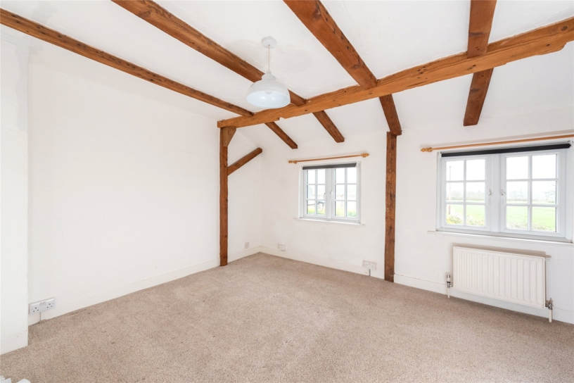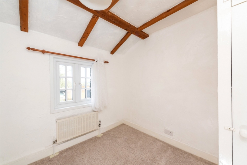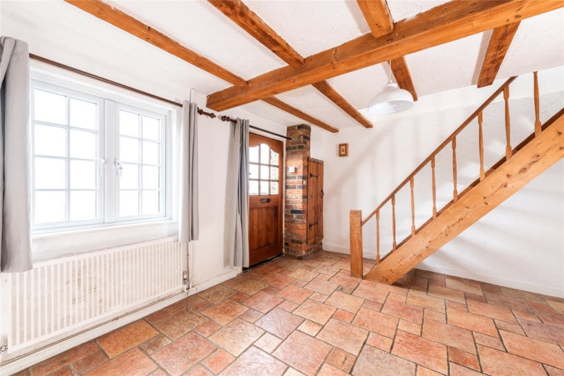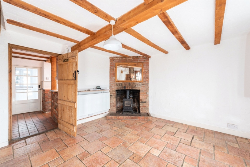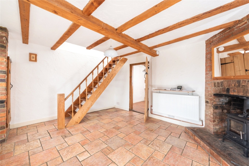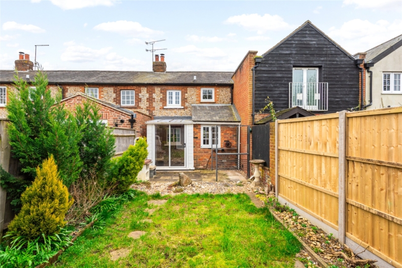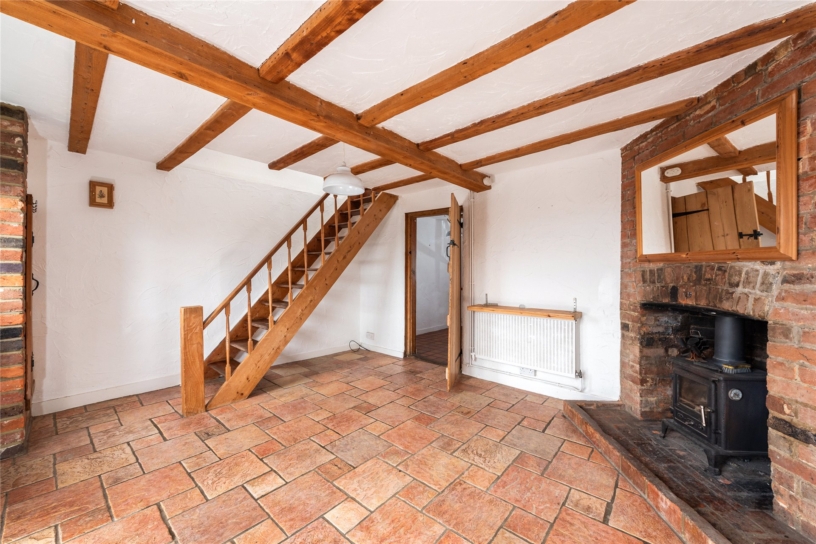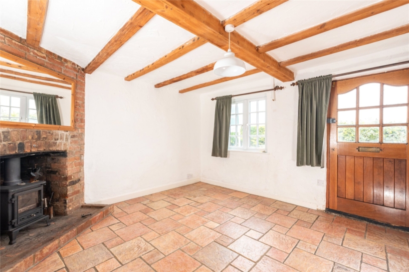 This flint and brick under slate property has approximately 691 sq. ft. of accommodation arranged over two floors and views overlooking the countryside. The ground floor has a sitting room with a beamed ceiling, a tiled floor, and a brick fireplace with a tiled hearth housing a log burning stove. There is also a built-in cupboard. An original cottage door in the sitting room accesses a kitchen/dining room which in turn has a glazed door to a conservatory leading to the rear garden. This is enclosed by fencing with planted borders and is mainly laid to lawn with a patio. There is a studio building which could be a home office or summer house and there is access at the bottom of the garden to private parking and a garage. On the first floor, the cottage has a double bedroom with two windows, a single bedroom overlooking the garden, and a bathroom with a side panel bath with a shower over, a vanity hand basin and a WC. The property is available with no chain.