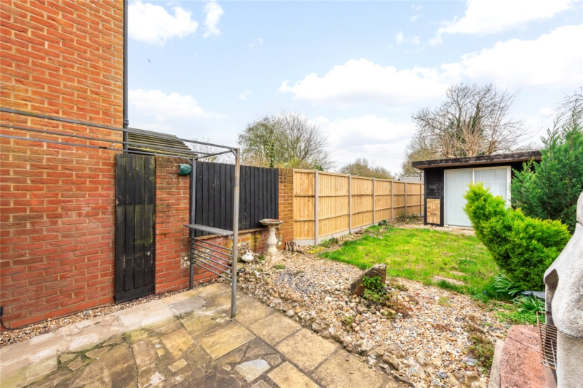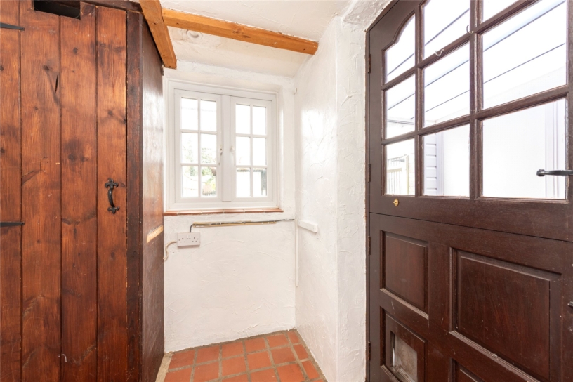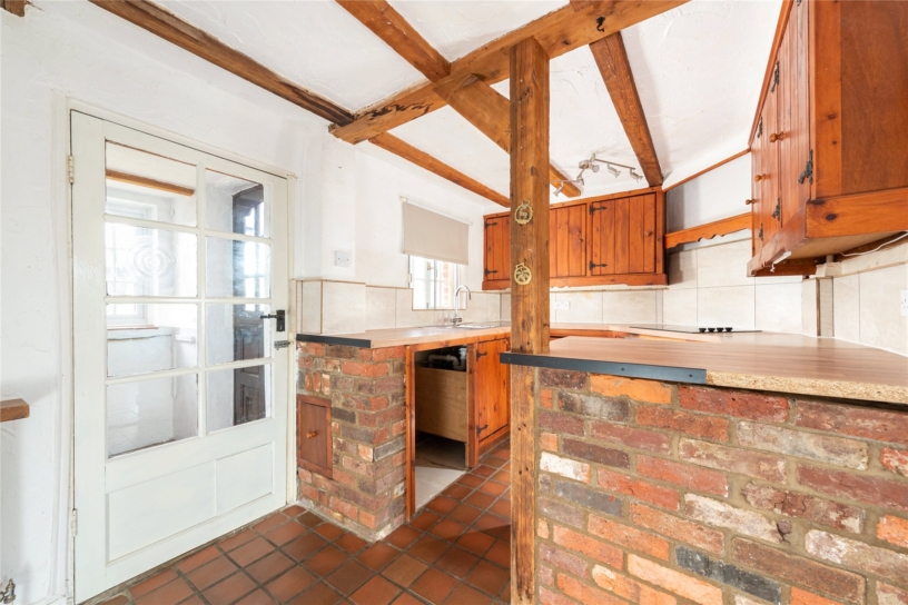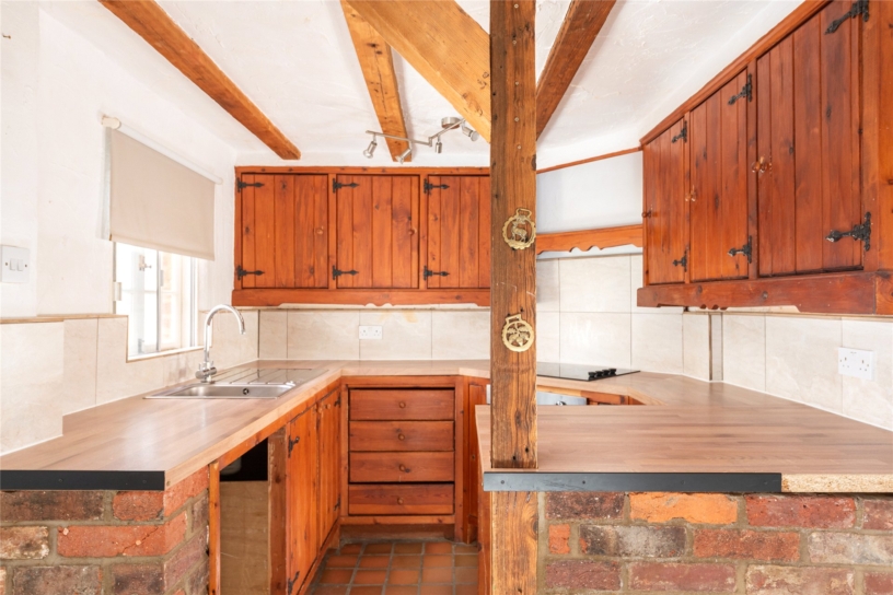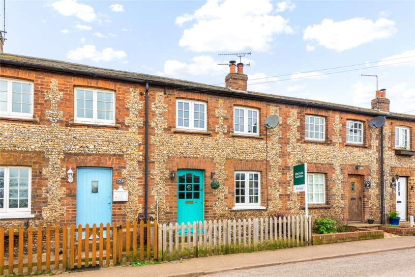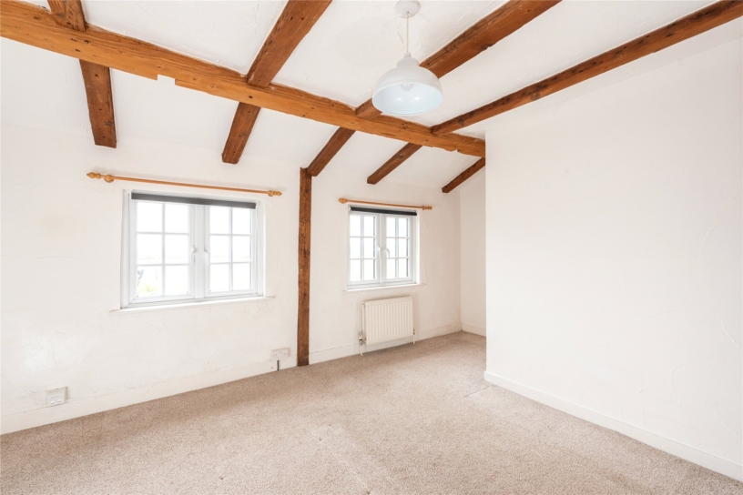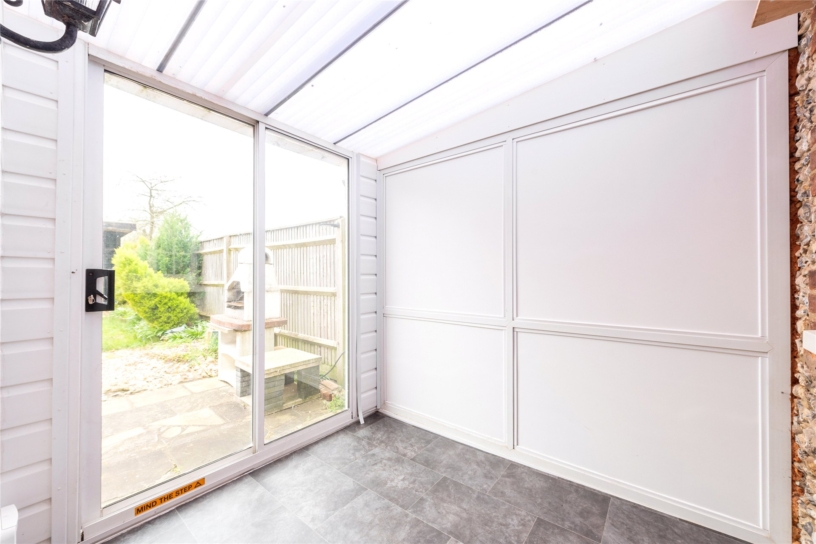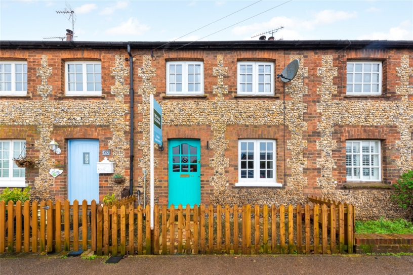 This flint and brick under slate property has approximately 691 sq. ft. of accommodation arranged over two floors and views overlooking the countryside. The ground floor has a sitting room with a beamed ceiling, a tiled floor, and a brick fireplace with a tiled hearth housing a log burning stove. There is also a built-in cupboard. An original cottage door in the sitting room accesses a kitchen/dining room which in turn has a glazed door to a conservatory leading to the rear garden. This is enclosed by fencing with planted borders and is mainly laid to lawn with a patio. There is a studio building which could be a home office or summer house and there is access at the bottom of the garden to private parking and a garage. On the first floor, the cottage has a double bedroom with two windows, a single bedroom overlooking the garden, and a bathroom with a side panel bath with a shower over, a vanity hand basin and a WC. The property is available with no chain.