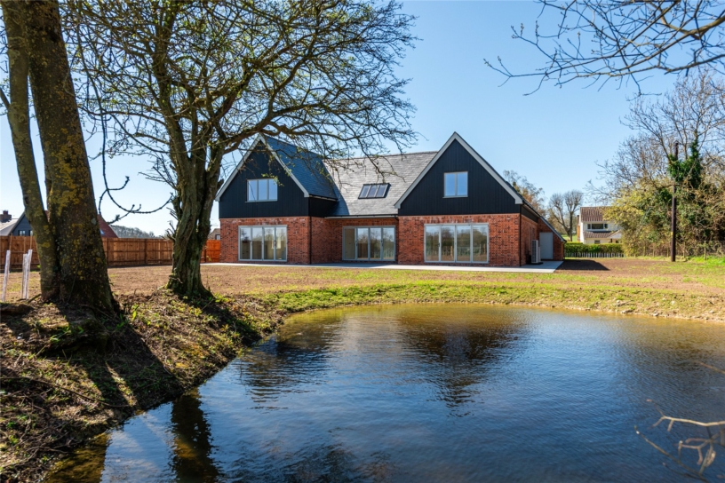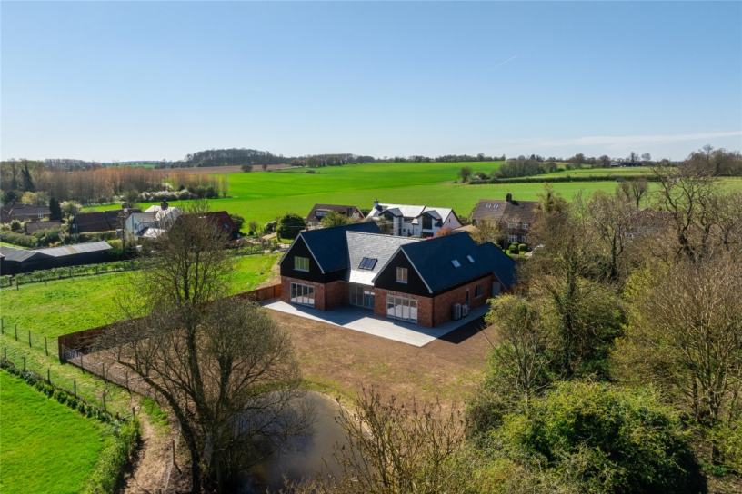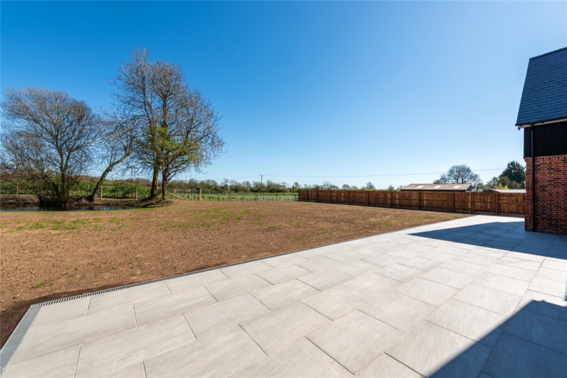 The property is situated on a no through road in the village. It is access by a shared tarmac driveway which is intended to be used by one other property in the future. There is a gravel driveway providing parking for up to nine cars leading to the double garage. The side gate leads round to the back garden which has a porcelain tiled patio area adjacent to the back of the house and accessible from the three sets of bi-folds doors in the open plan space. The rear garden has been levelled and seeded to be mainly laid to lawn. Towards the rear of the garden is a pond and there are established trees. There is timber fencing enclosing one side and there are low wire fences elsewhere along hedged and tree lined borders or to maintain uninterrupted views to the rear.