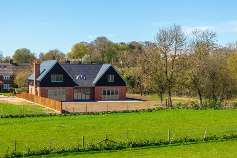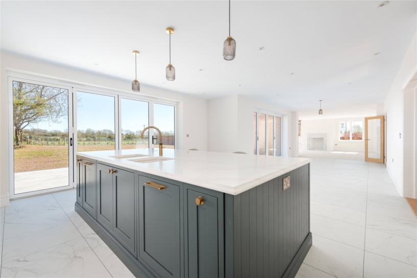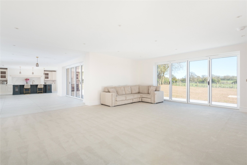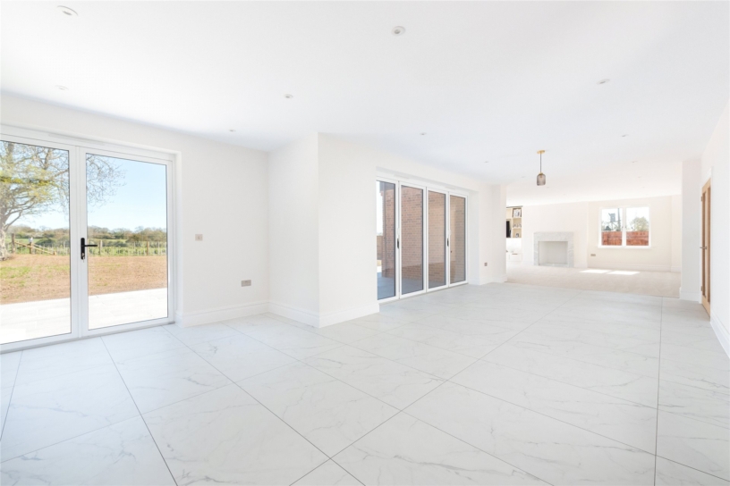 The house has over 3,800 sq. ft. of versatile accommodation arranged over two floors. The part glazed front door opens to an entrance hall with oak flooring and a bespoke wooden staircase with glazed baluster rising to the first floor landing. From the entrance hall, two sets of glazed double doors access the kitchen/dining room which is open plan to the sitting area and there are two separate reception rooms: the cinema room and the study/snug. Also on the ground floor are separate boot and utility rooms, and a shower/wet room. Leading off the galleried landing are four double bedrooms, two with dressing rooms and two with en suite bath or shower rooms. There is also potential for an additional fifth bedroom on the ground floor by repurposing the study/snug if desired. In a rural setting, the property has been built on paddock land and has a public footpath to the rear leading directly into open countryside, ensuring that many rooms have far reaching country views.
