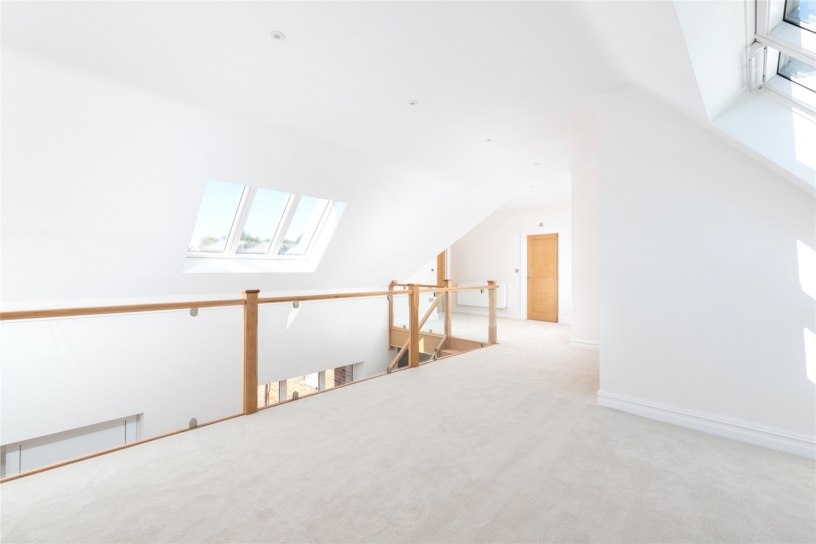 The galleried landing has a built-in cupboard with double doors and a further smaller storage cupboard. The area is illuminated by Velux windows on both sides of the vaulted roof and due to the glazed balusters, natural light also permeates up from the entrance hallway window.