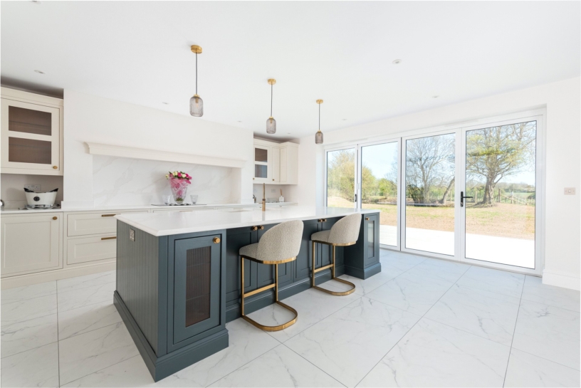 A particular feature of this property is the open plan living accommodation running along the entire rear of the house, with three sets of bi-folding doors taking advantage of the views over the garden and the countryside beyond. The kitchen/dining area measures nearly 39 ft. by over 18 ft. The bespoke kitchen was fitted by ParkerRose Interiors of St Ives and has a comprehensive range of painted units with a combination of glazed cupboards, drawers, and shelved cupboards. Double opening pocket doors reveal a concealed breakfast cupboard with power points for a toaster and kettle. The island has breakfast seating, a built-in dishwasher, and quartz worksurface with two inset ceramic sinks and a Quooker tap over. All integrated appliances are made by Siemens and include a double oven, a hob, a fridge, and a freezer. The dining area, overlooking the patio and garden beyond, has ample room for a dining table and the sitting area, measuring over 23 ft. by over 19 ft. has the same bi-folds as the other areas as well as a window over the side garden and a marble fireplace and hearth with a media wall to one side. The entire area has uniform marble effect oversize floor tiles.
