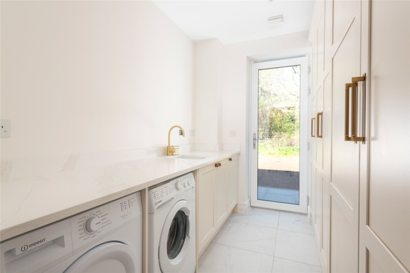 Accessed from the entrance hall, the boot room has built-in, low-level cupboards with coat hooks along the wall; there is a door leading through to the utility room which has a fully glazed external door to the side. There are floor-to-ceiling built-in cupboards along one wall, including one housing a Megaflo hot water cylinder for the house. On the other side there are fitted base units with quartz worksurfaces, an inset ceramic sink, and space and plumbing for a washing machine and a tumble dryer.