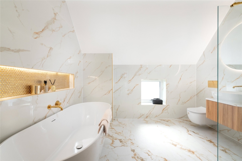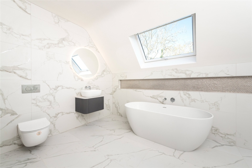 Accessed off the landing and shared by bedrooms three and four, the main four piece contemporary bathroom has a Velux window immediately over the free standing Porcelanosa bath. It is fully tiled with matching floor tiles and has a glass shower cubicle, a hanging vanity unit with a counter basin, and a close coupled WC.