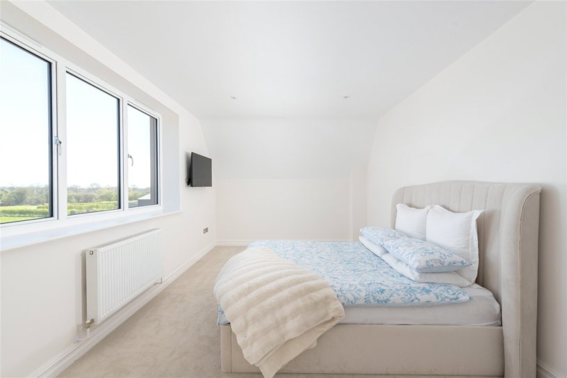 A door from the landing opens to a passage leading to the principal bedroom and gives access to a walk-through dressing room with a range of built-in wardrobes along both side walls. The bedroom has a window in the gable overlooking the rear garden. The fully tiled en suite bathroom has a Porcelanosa free standing bath with a central tap, a glass shower cubicle, a close coupled WC and a hanging vanity unit with a marble top and matching sink above. There is a heated towel rail and a frosted window to the side. The over 19 ft. bedroom has far-reaching views over the garden and countryside to the rear.