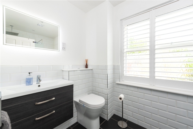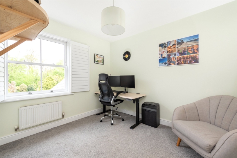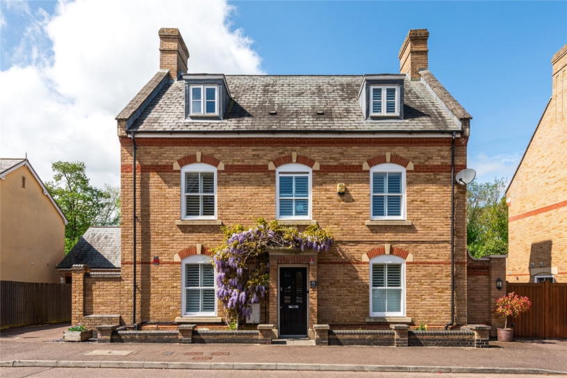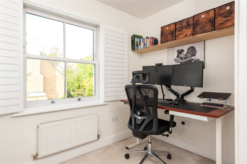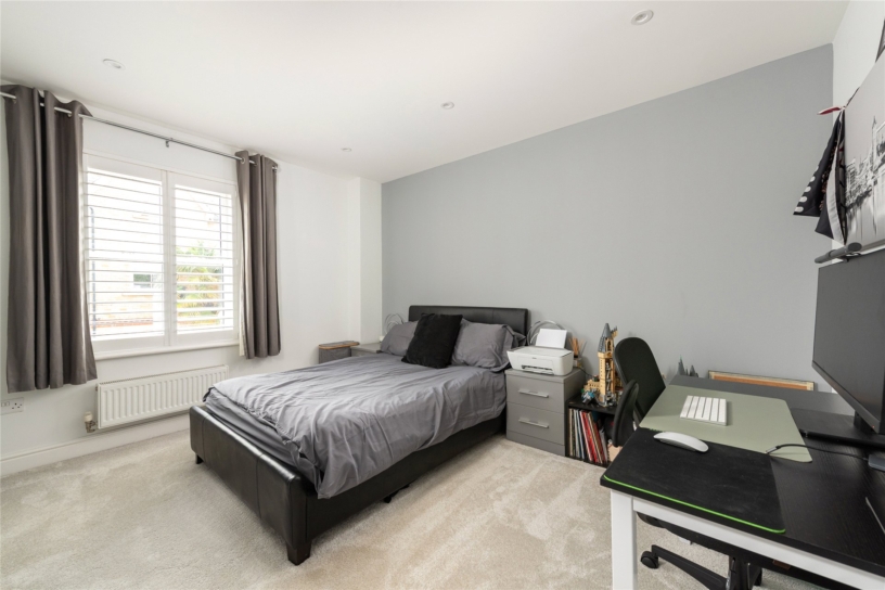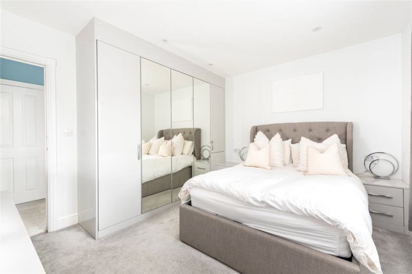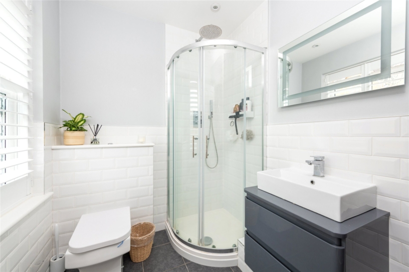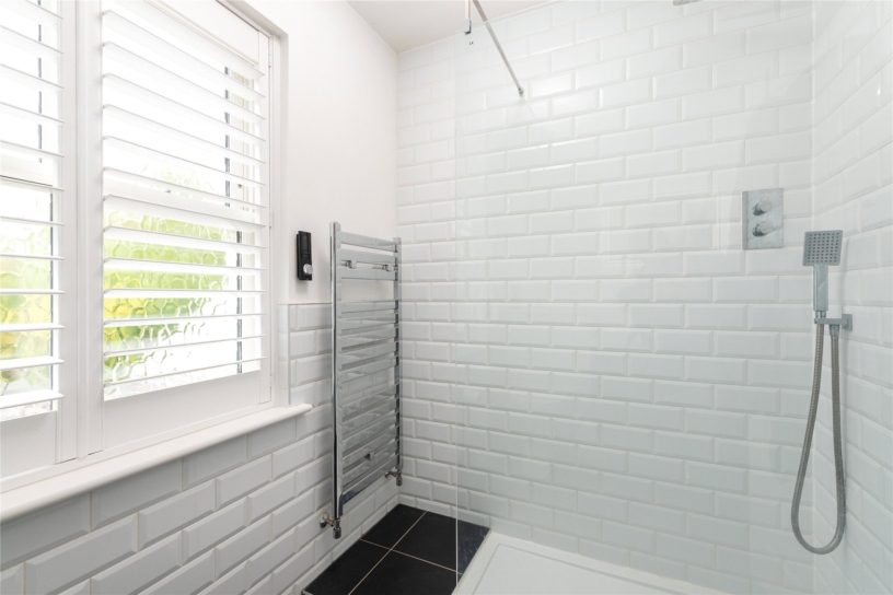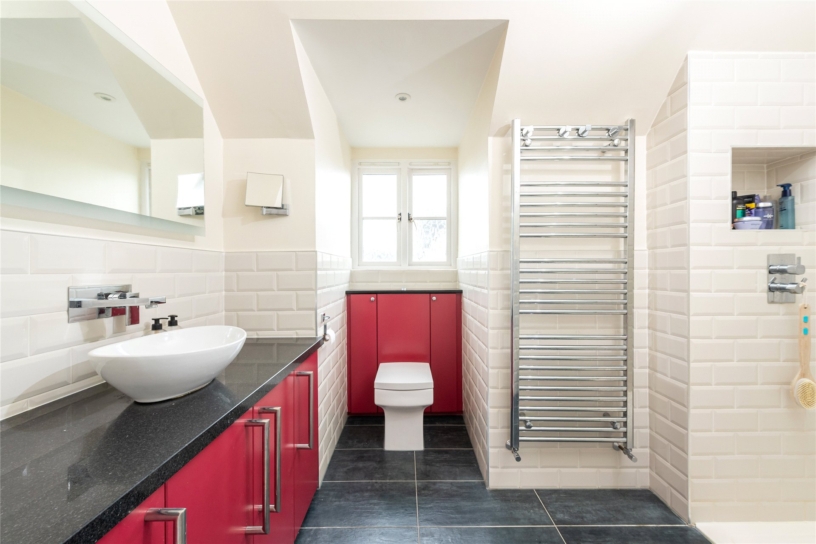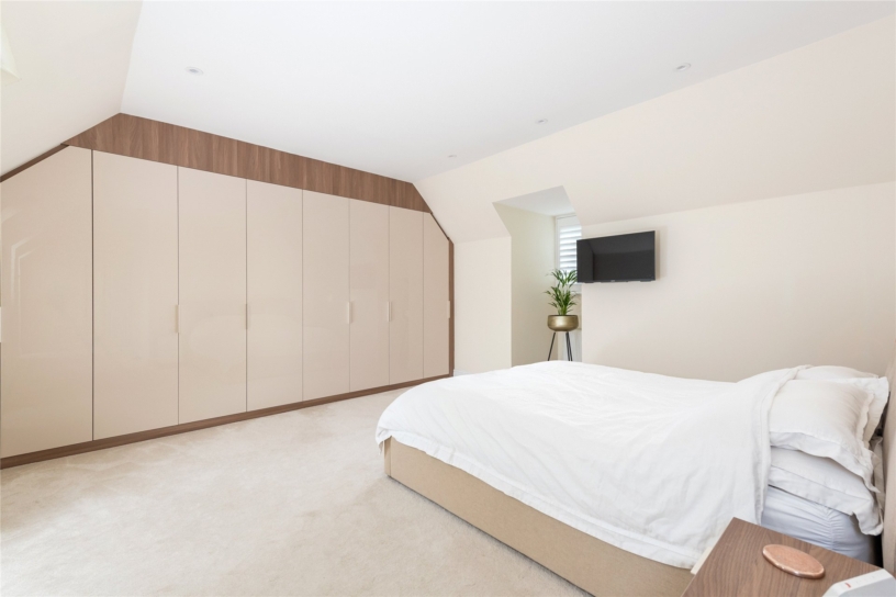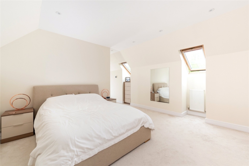 All four first floor bedrooms are doubles. Bedrooms two, three and five have fitted storage and bedroom three has an en suite shower room. The main bathroom is fully tiled with a walk-in shower, a vanity basin, and a WC. The second-floor principal bedroom suite is 26 ft. by 16 ft. with a wall of fitted wardrobes, a window to the front, and three Velux windows. A walk-in wardrobe has rails, shelving and space for a dressing table. The en suite shower room has a walk-in shower.