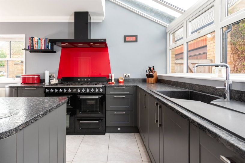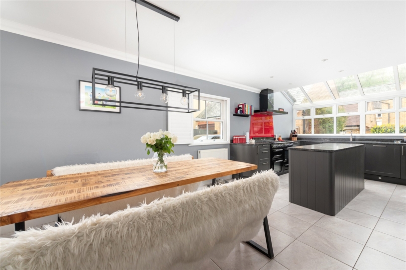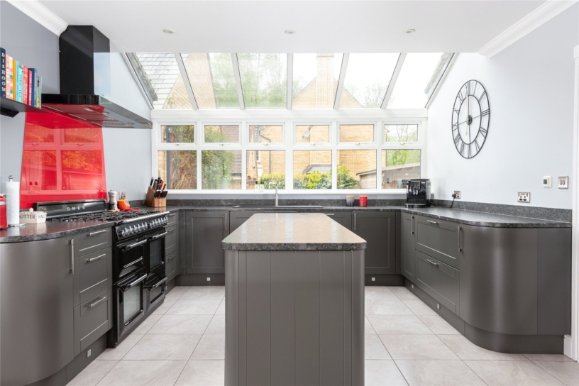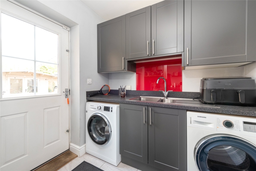 The modern Shaker style fitted kitchen area has full glass ceiling panels and windows to the rear, taking full advantage of the natural light and views of the garden. It has a range of wall and base cabinets, an inset sink, and a matching central island. There is space for an American style fridge/freezer and a Range cooker. The adjacent utility room has matching fitted cabinets with a sink, space for white goods, and a partially glazed door to the garden. The sitting room has a feature wood burner effect gas fire, a window to the front aspect, and French doors leading to the rear garden.