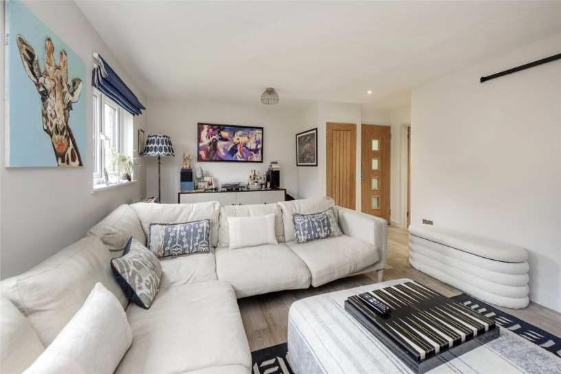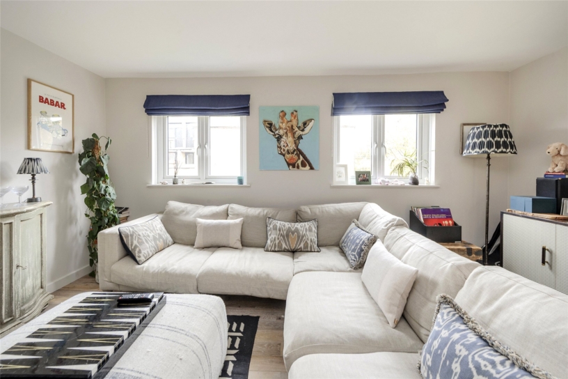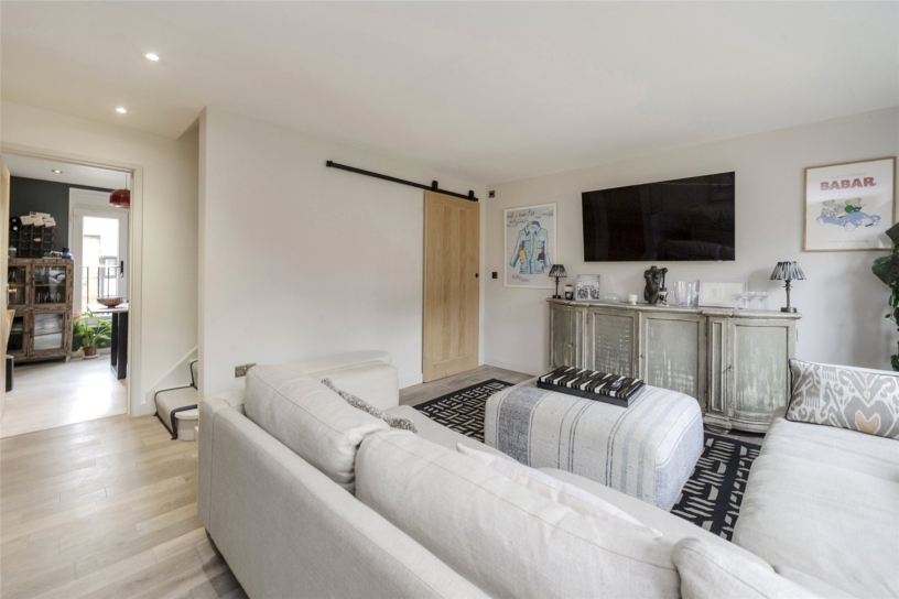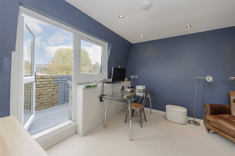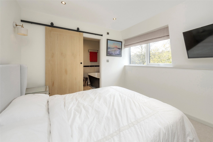 Upstairs, there are two double bedrooms, both with built-in storage. The principal bedroom has a window in the mansard roof overlooking the front and a feature wooden sliding door to the partially tiled en suite bathroom with additional floor-to-ceiling storage and a modern roll top bath. There is also a shower room and guest bedroom located off the landing. This second bedroom is positioned at the rear with a glass panelled door leading to the private decked terrace with a brick balustrade.