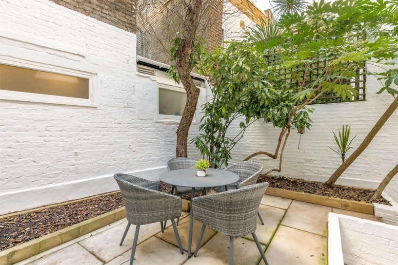Located in Brunswick Gardens, this two-bedroom apartment has been thoughtfully refurbished to offer a blend of classic and modern design. The apartment has its own entrance, accessed via a set of steps from the street, which opens into an entrance hall with plenty of cloakroom storage. The reception room is at the front of the building and features high ceiling, a decorative fireplace with built-in cupboards and display shelves in the chimney recesses, wooden flooring and a neutral colour scheme that creates a bright and open feel. The Eggersman galley kitchen has a range of bespoke two tone wall and base cabinets and is equipped with Miele appliances, and marble-effect splashbacks. The garden is split level and has been designed for ease of maintenance with paved seating areas and raised beds with mature trees providing screening.