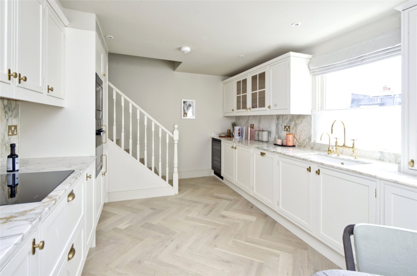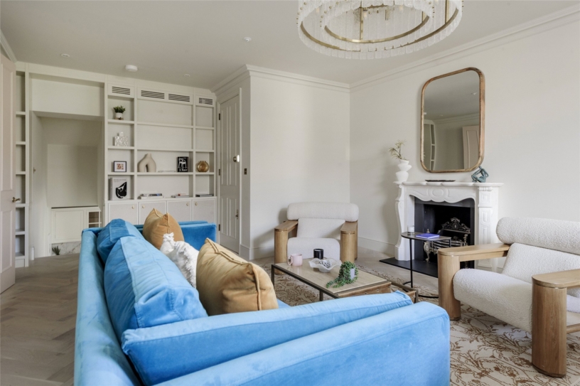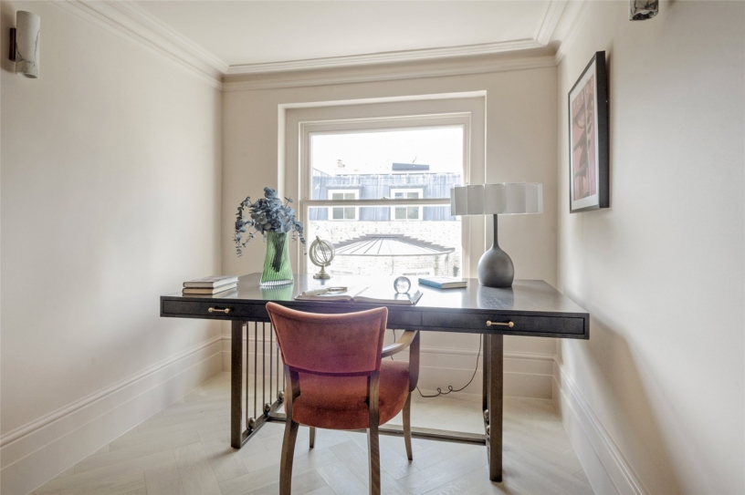 The reception/dining room is at the front of the building with views over Pembridge Square. It measures nearly 23 ft by just under 15 ft. and has a feature fireplace, built-in cupboards and display shelves, and space for soft seating and a dining area. Steps down lead to the fitted kitchen which is at the rear of the building and has a range of bespoke base and wall units, including glazed display cabinets, with deVOL brassware, marble work surfaces and splashbacks, and state-of-the-art Miele appliances.