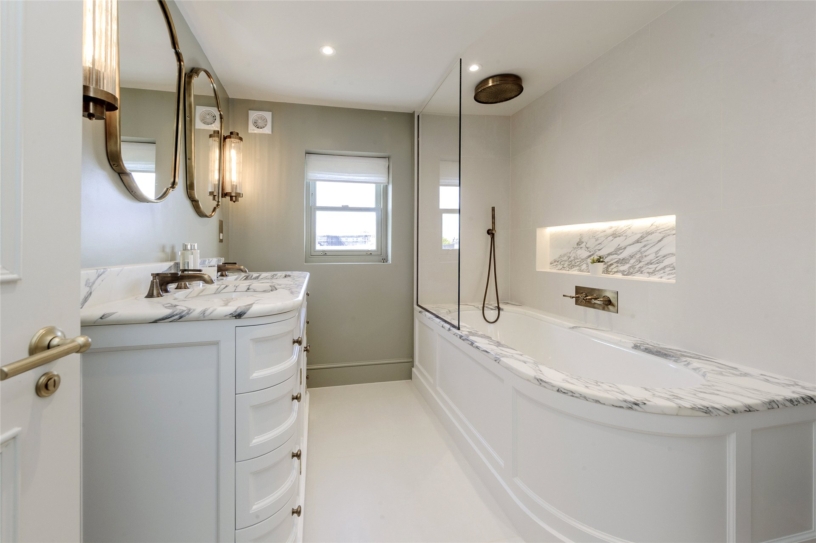 The principal bedroom suite is at the rear of the building and has built in bespoke wardrobes and an en-suite Porter bathroom with twin vanity washbasins, a WC, a bath with a shower over, and a window for natural light. There are two further double bedrooms which both overlook the front of the property and have bespoke wardrobes. These bedrooms share a family Porter bathroom which has a bath with a marble surround and an overhead shower, a vanity washbasin, a WC, and a window for natural light.